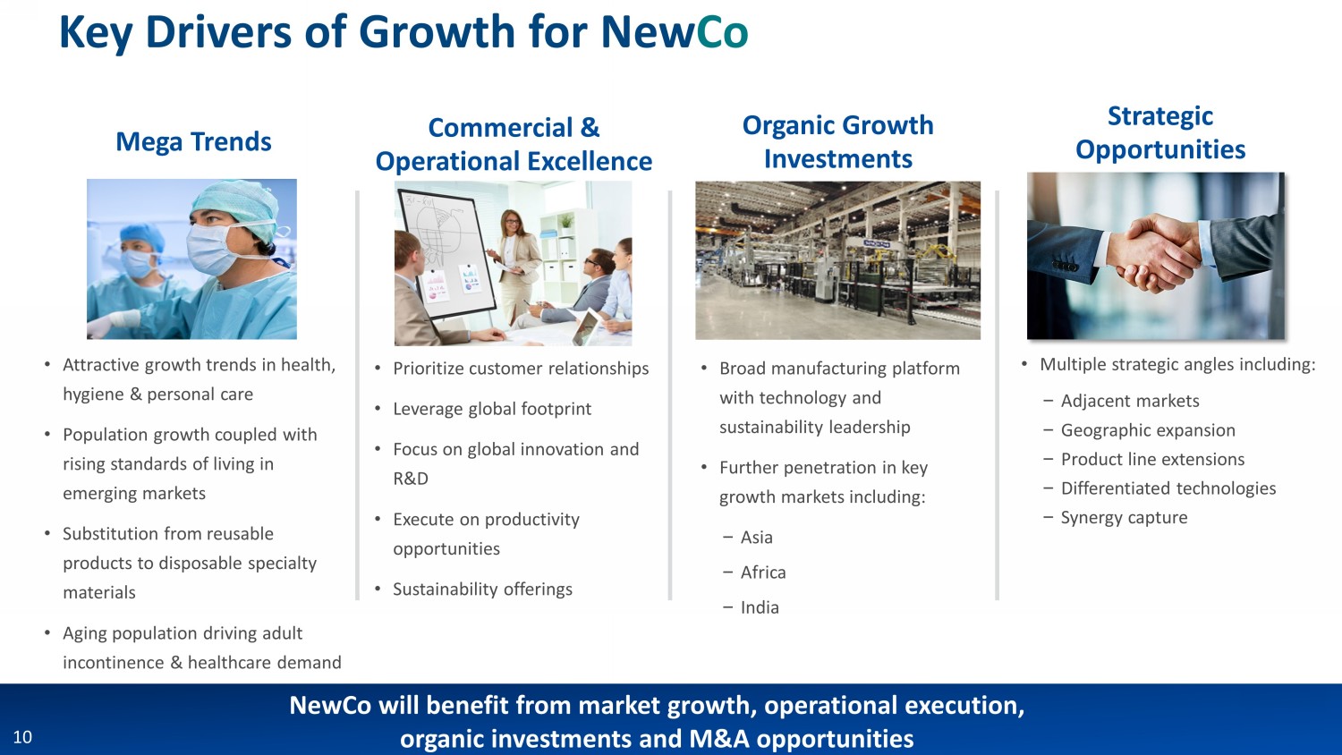 Organic Growth Investments • Broad manufacturing platform with technology and sustainability leadership • Further penetration in key growth markets including: ‒ Asia ‒ Africa ‒ India Commercial & Operational Excellence • Prioritize customer relationships • Leverage global footprint • Focus on global innovation and R&D • Execute on productivity opportunities • Sustainability offerings Strategic Opportunities • Multiple strategic angles including: ‒ Adjacent markets ‒ Geographic expansion ‒ Product line extensions ‒ Differentiated technologies ‒ Synergy capture Mega Trends • Attractive growth trends in health, hygiene & personal care • Population growth coupled with rising standards of living in emerging markets • Substitution from reusable products to disposable specialty materials • Aging population driving adult incontinence & healthcare demand NewCo will benefit from market growth, operational execution, organic investments and M&A opportunities 10 Key Drivers of Growth for New Co
