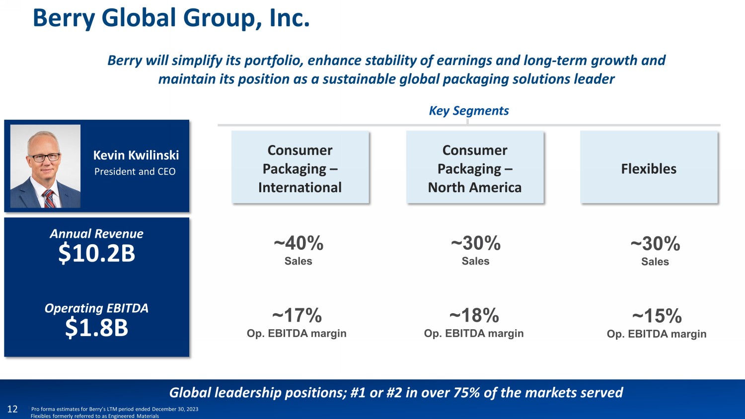 Kevin Kwilinski President and CEO Berry will simplify its portfolio, enhance stability of earnings and long - term growth and maintain its position as a sustainable global packaging solutions leader Key Segments Consumer Packaging – North America Consumer Packaging – International Flexibles 1 Pro forma estimates for Berry’s LTM period ended December 30, 2023 Flexibles formerly referred to as Engineered Materials Annual Revenue $10.2B Operating EBITDA $1.8B Global leadership positions; #1 or #2 in over 75% of the markets served ~30% Sales ~40% Sales ~30% Sales ~18% Op. EBITDA margin ~17% Op. EBITDA margin ~15% Op. EBITDA margin 12 Berry Global Group, Inc.