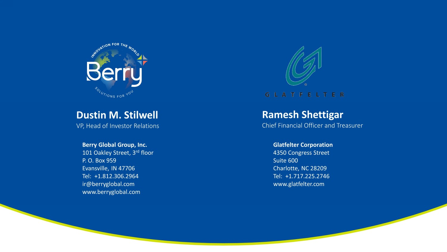 Dustin M. Stilwell VP, Head of Investor Relations Berry Global Group, Inc. 101 Oakley Street, 3 rd floor P. O. Box 959 Evansville, IN 47706 Tel: +1.812.306.2964 ir@berryglobal.com www.berryglobal.com Ramesh Shettigar Chief Financial Officer and Treasurer Glatfelter Corporation 4350 Congress Street Suite 600 Charlotte, NC 28209 Tel: +1.717.225.2746 www.glatfelter.com