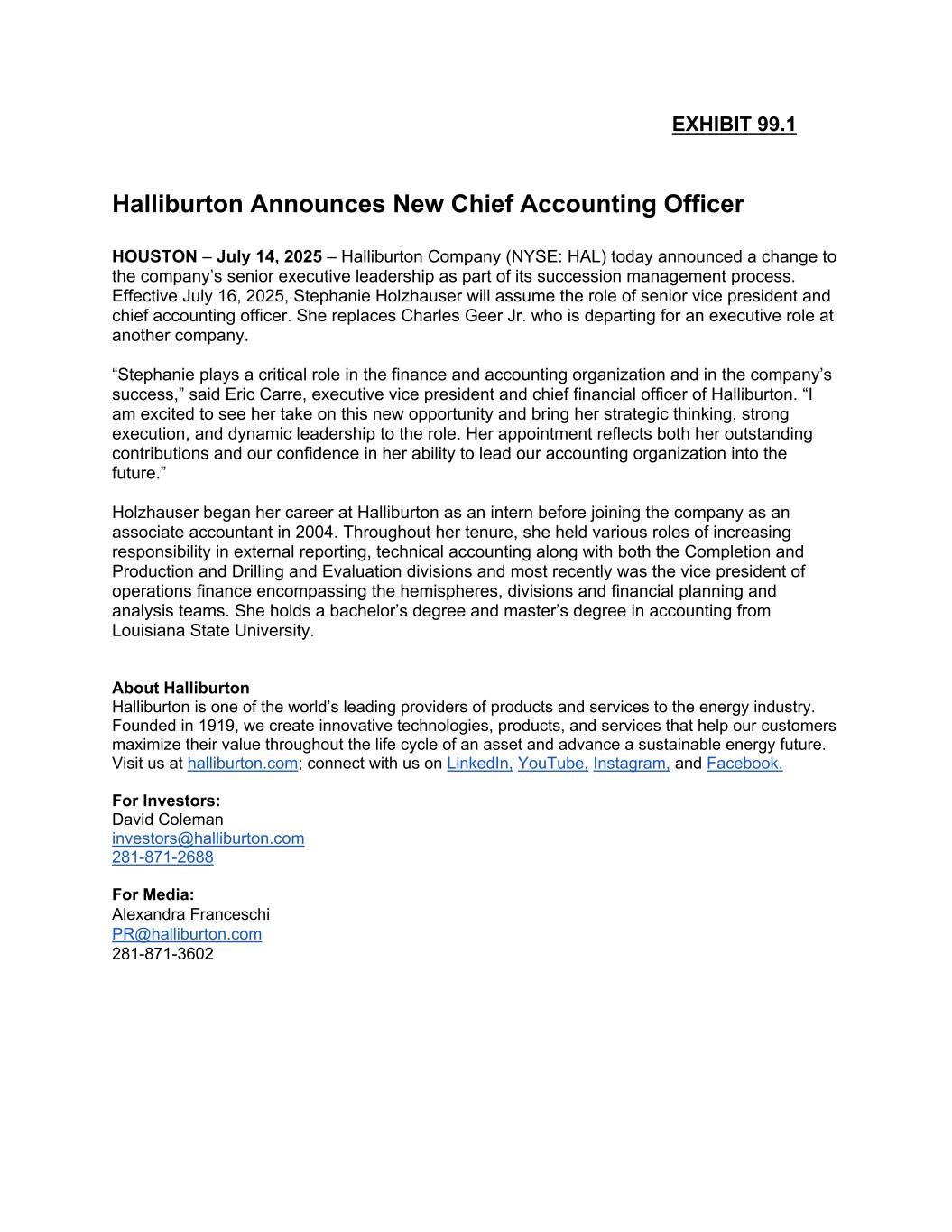 EXHIBIT 99.1 Halliburton Announces New Chief Accounting Officer HOUSTON – July 14, 2025 – Halliburton Company (NYSE: HAL) today announced a change to the company’s senior executive leadership as part of its succession management process. Effective July 16, 2025, Stephanie Holzhauser will assume the role of senior vice president and chief accounting officer. She replaces Charles Geer Jr. who is departing for an executive role at another company. “Stephanie plays a critical role in the finance and accounting organization and in the company’s success,” said Eric Carre, executive vice president and chief financial officer of Halliburton. “I am excited to see her take on this new opportunity and bring her strategic thinking, strong execution, and dynamic leadership to the role. Her appointment reflects both her outstanding contributions and our confidence in her ability to lead our accounting organization into the future.” Holzhauser began her career at Halliburton as an intern before joining the company as an associate accountant in 2004. Throughout her tenure, she held various roles of increasing responsibility in external reporting, technical accounting along with both the Completion and Production and Drilling and Evaluation divisions and most recently was the vice president of operations finance encompassing the hemispheres, divisions and financial planning and analysis teams. She holds a bachelor’s degree and master’s degree in accounting from Louisiana State University. About Halliburton Halliburton is one of the world’s leading providers of products and services to the energy industry. Founded in 1919, we create innovative technologies, products, and services that help our customers maximize their value throughout the life cycle of an asset and advance a sustainable energy future. Visit us at halliburton.com; connect with us on LinkedIn, YouTube, Instagram, and Facebook. For Investors: David Coleman investors@halliburton.com 281-871-2688 For Media: Alexandra Franceschi PR@halliburton.com 281-871-3602