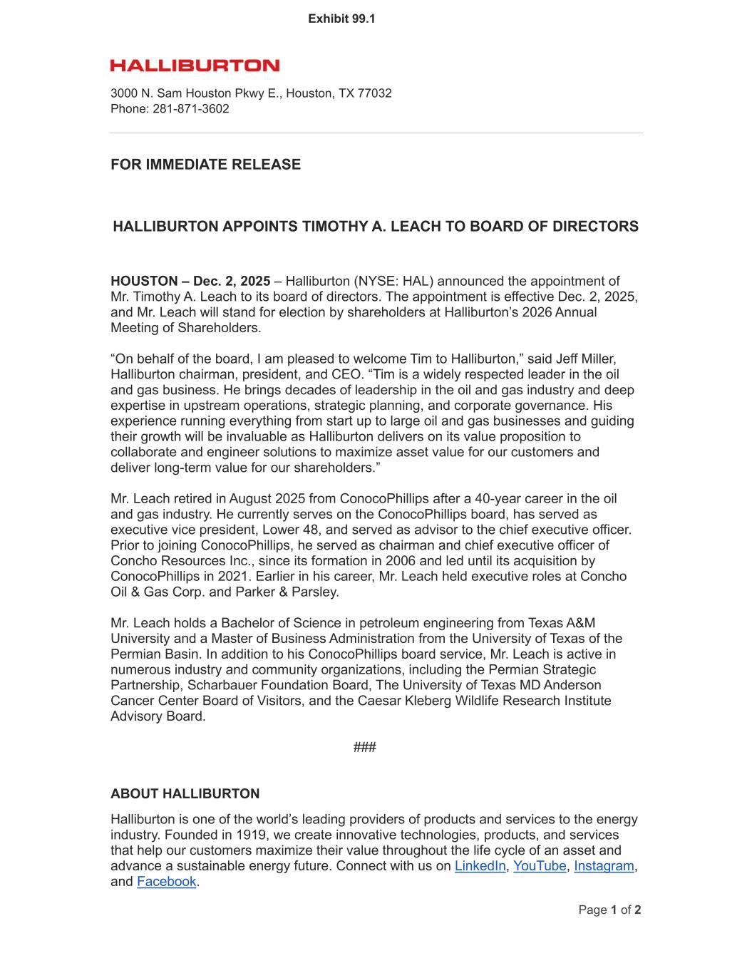 3000 N. Sam Houston Pkwy E., Houston, TX 77032 Phone: 281-871-3602 Page 1 of 2 FOR IMMEDIATE RELEASE HALLIBURTON APPOINTS TIMOTHY A. LEACH TO BOARD OF DIRECTORS HOUSTON – Dec. 2, 2025 – Halliburton (NYSE: HAL) announced the appointment of Mr. Timothy A. Leach to its board of directors. The appointment is effective Dec. 2, 2025, and Mr. Leach will stand for election by shareholders at Halliburton’s 2026 Annual Meeting of Shareholders. “On behalf of the board, I am pleased to welcome Tim to Halliburton,” said Jeff Miller, Halliburton chairman, president, and CEO. “Tim is a widely respected leader in the oil and gas business. He brings decades of leadership in the oil and gas industry and deep expertise in upstream operations, strategic planning, and corporate governance. His experience running everything from start up to large oil and gas businesses and guiding their growth will be invaluable as Halliburton delivers on its value proposition to collaborate and engineer solutions to maximize asset value for our customers and deliver long-term value for our shareholders.” Mr. Leach retired in August 2025 from ConocoPhillips after a 40-year career in the oil and gas industry. He currently serves on the ConocoPhillips board, has served as executive vice president, Lower 48, and served as advisor to the chief executive officer. Prior to joining ConocoPhillips, he served as chairman and chief executive officer of Concho Resources Inc., since its formation in 2006 and led until its acquisition by ConocoPhillips in 2021. Earlier in his career, Mr. Leach held executive roles at Concho Oil & Gas Corp. and Parker & Parsley. Mr. Leach holds a Bachelor of Science in petroleum engineering from Texas A&M University and a Master of Business Administration from the University of Texas of the Permian Basin. In addition to his ConocoPhillips board service, Mr. Leach is active in numerous industry and community organizations, including the Permian Strategic Partnership, Scharbauer Foundation Board, The University of Texas MD Anderson Cancer Center Board of Visitors, and the Caesar Kleberg Wildlife Research Institute Advisory Board. ### ABOUT HALLIBURTON Halliburton is one of the world’s leading providers of products and services to the energy industry. Founded in 1919, we create innovative technologies, products, and services that help our customers maximize their value throughout the life cycle of an asset and advance a sustainable energy future. Connect with us on LinkedIn, YouTube, Instagram, and Facebook. Exhibit 99.1