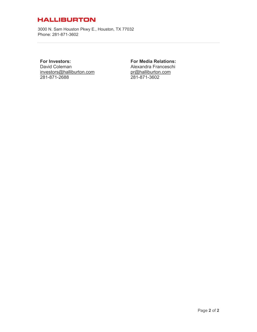 3000 N. Sam Houston Pkwy E., Houston, TX 77032 Phone: 281-871-3602 Page 2 of 2 For Investors: David Coleman investors@halliburton.com 281-871-2688 For Media Relations: Alexandra Franceschi pr@halliburton.com 281-871-3602