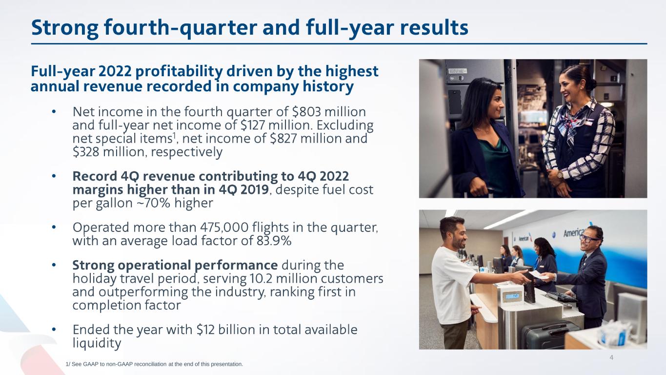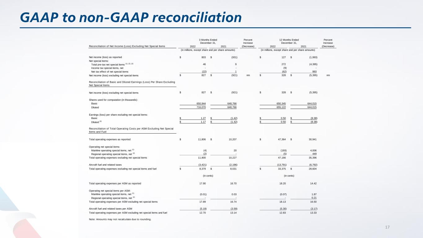 16 Percent Increase Percent Increase Reconciliation of Operating Income (Loss) Excluding Net Special Items 2022 2021 (Decrease) 2022 2021 (Decrease) Operating income (loss) as reported 1,383$ (780)$ 1,607$ (1,059)$ Operating net special items: Mainline operating special items, net (1) 4 (20) 193 (4,006) Regional operating special items, net (2) 2 - 5 (449) Operating income (loss) excluding net special items $ 1,389 $ (800) nm $ 1,805 $ (5,514) nm Calculation of Operating Margin Operating income (loss) as reported $ 1,383 $ (780) $ 1,607 $ (1,059) Total operating revenues as reported $ 13,189 $ 9,427 $ 48,971 $ 29,882 Operating margin 10.5% (8.3%) 3.3% (3.5%) Calculation of Operating Margin Excluding Net Special Items Operating income (loss) excluding net special items $ 1,389 $ (800) $ 1,805 $ (5,514) Total operating revenues as reported $ 13,189 $ 9,427 $ 48,971 $ 29,882 Operating margin excluding net special items 10.5% (8.5%) 3.7% (18.4%) Reconciliation of Pre-Tax Income (Loss) Excluding Net Special Items Pre-tax income (loss) as reported 1,011$ (1,191)$ 186$ (2,548)$ Pre-tax net special items: Mainline operating special items, net (1) 4 (20) 193 (4,006) Regional operating special items, net (2) 2 - 5 (449) Nonoperating special items, net (3) 40 29 74 60 Total pre-tax net special items 46 9 272 (4,395) Pre-tax income (loss) excluding net special items 1,057$ (1,182)$ nm 458$ (6,943)$ nm Calculation of Pre-Tax Margin Pre-tax income (loss) as reported $ 1,011 $ (1,191) $ 186 $ (2,548) Total operating revenues as reported $ 13,189 $ 9,427 $ 48,971 $ 29,882 Pre-tax margin 7.7% (12.6%) 0.4% (8.5%) Calculation of Pre-Tax Margin Excluding Net Special Items Pre-tax income (loss) excluding net special items $ 1,057 $ (1,182) $ 458 $ (6,943) Total operating revenues as reported $ 13,189 $ 9,427 $ 48,971 $ 29,882 Pre-tax margin excluding net special items 8.0% (12.5%) 0.9% (23.2%) 3 Months Ended December 31, (in millions) (in millions) 12 Months Ended December 31,