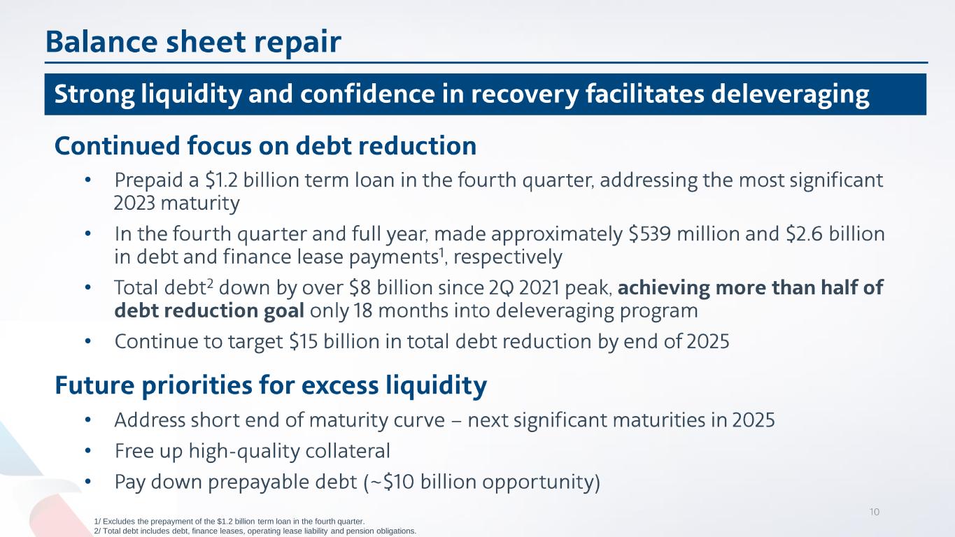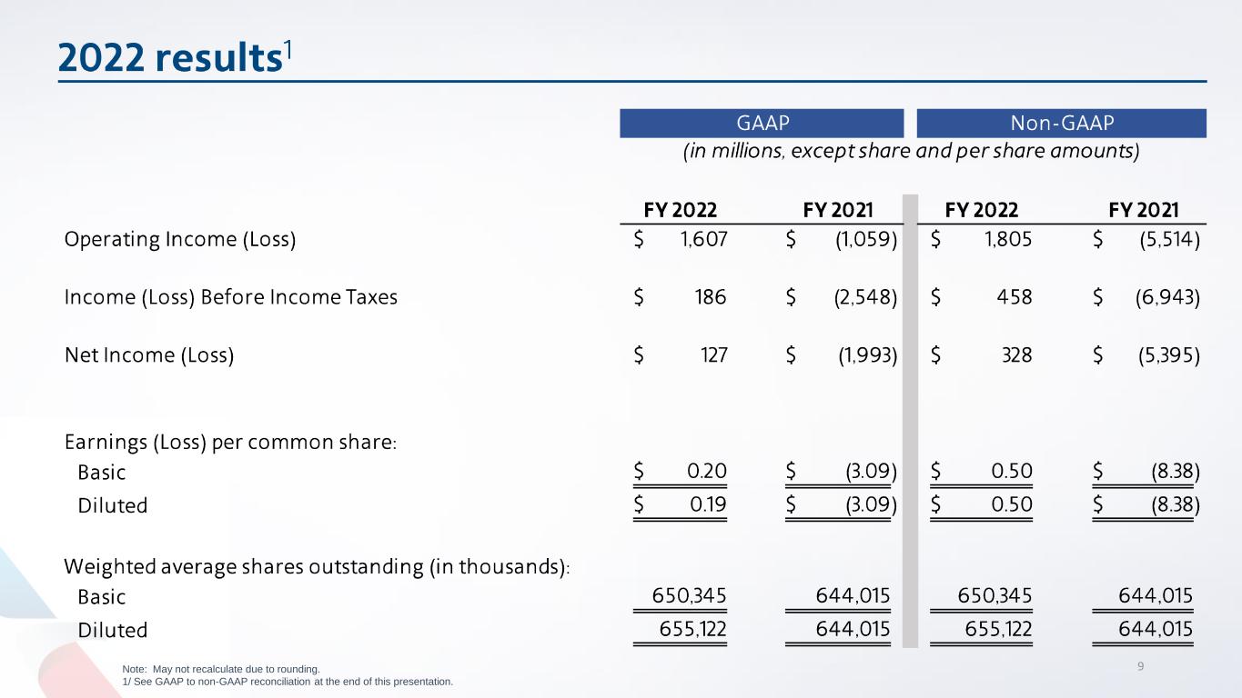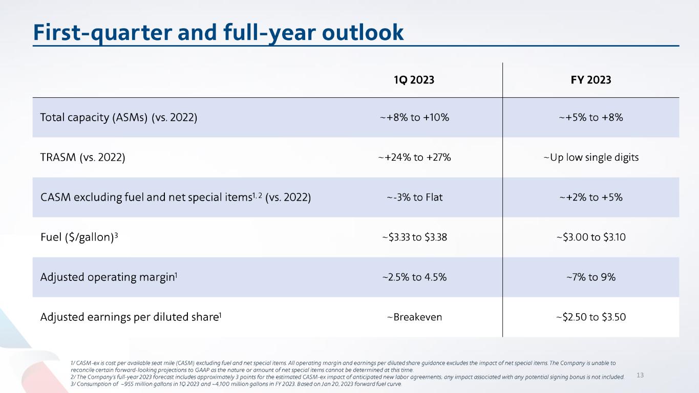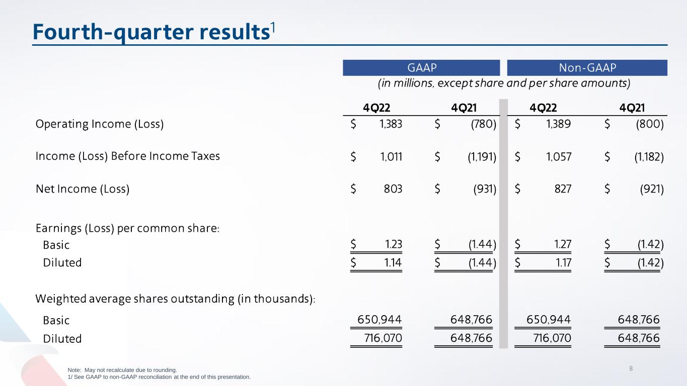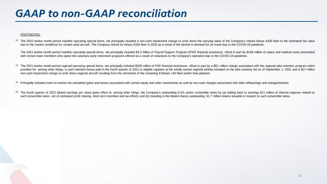 17 Percent Increase Percent Increase Reconciliation of Net Income (Loss) Excluding Net Special Items 2022 2021 (Decrease) 2022 2021 (Decrease) Net income (loss) as reported 803$ (931)$ 127$ (1,993)$ Net special items: Total pre-tax net special items (1), (2), (3) 46 9 272 (4,395) Income tax special items, net - - (9) - Net tax effect of net special items (22) 1 (62) 993 Net income (loss) excluding net special items 827$ (921)$ nm 328$ (5,395)$ nm Reconciliation of Basic and Diluted Earnings (Loss) Per Share Excluding Net Special Items Net income (loss) excluding net special items 827$ (921)$ 328$ (5,395)$ Shares used for computation (in thousands): Basic 650,944 648,766 650,345 644,015 Diluted 716,070 648,766 655,122 644,015 Earnings (loss) per share excluding net special items: Basic 1.27$ (1.42)$ 0.50$ (8.38)$ Diluted (4) 1.17$ (1.42)$ 0.50$ (8.38)$ Reconciliation of Total Operating Costs per ASM Excluding Net Special Items and Fuel Total operating expenses as reported 11,806$ 10,207$ 47,364$ 30,941$ Operating net special items: Mainline operating special items, net (1) (4) 20 (193) 4,006 Regional operating special items, net (2) (2) - (5) 449 Total operating expenses excluding net special items 11,800 10,227 47,166 35,396 Aircraft fuel and related taxes (3,421) (2,196) (13,791) (6,792) Total operating expenses excluding net special items and fuel 8,379$ 8,031$ 33,375$ 28,604$ Total operating expenses per ASM as reported 17.90 16.70 18.20 14.42 Operating net special items per ASM: Mainline operating special items, net (1) (0.01) 0.03 (0.07) 1.87 Regional operating special items, net (2) - - - 0.21 Total operating expenses per ASM excluding net special items 17.89 16.74 18.13 16.50 Aircraft fuel and related taxes per ASM (5.19) (3.59) (5.30) (3.17) Total operating expenses per ASM excluding net special items and fuel 12.70 13.14 12.83 13.33 Note: Amounts may not recalculate due to rounding. 3 Months Ended December 31, 12 Months Ended December 31, (in cents) (in cents) (in millions, except share and per share amounts) (in millions, except share and per share amounts)