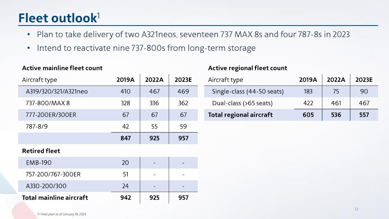 18 FOOTNOTES: (1) (2) (3) (4) The 2021 twelve month period regional operating special items, net principally included $539 million of PSP financial assistance, offset in part by a $61 million charge associated with the regional pilot retention program which provides for, among other things, a cash retention bonus paid in the fourth quarter of 2021 to eligible captains at the wholly-owned regional airlines included on the pilot seniority list as of September 1, 2021 and a $27 million non-cash impairment charge to write down regional aircraft resulting from the retirement of the remaining Embraer 140 fleet earlier than planned. The 2022 twelve month period mainline operating special items, net principally included a non-cash impairment charge to write down the carrying value of the Company's retired Airbus A330 fleet to the estimated fair value due to the market conditions for certain used aircraft. The Company retired its Airbus A330 fleet in 2020 as a result of the decline in demand for air travel due to the COVID-19 pandemic. The 2021 twelve month period mainline operating special items, net principally included $4.2 billion of Payroll Support Program (PSP) financial assistance, offset in part by $168 million of salary and medical costs associated with certain team members who opted into voluntary early retirement programs offered as a result of reductions to the Company's operation due to the COVID-19 pandemic. The fourth quarter of 2022 diluted earnings per share gives effect to, among other things, the Company's outstanding 6.5% senior convertible notes by (a) adding back to earnings $11 million of interest expense related to such convertible notes, net of estimated profit sharing, short-term incentive and tax effects and (b) including in the diluted shares outstanding, 61.7 million shares issuable in respect to such convertible notes. Principally included mark-to-market net unrealized gains and losses associated with certain equity and other investments as well as non-cash charges associated with debt refinancings and extinguishments.