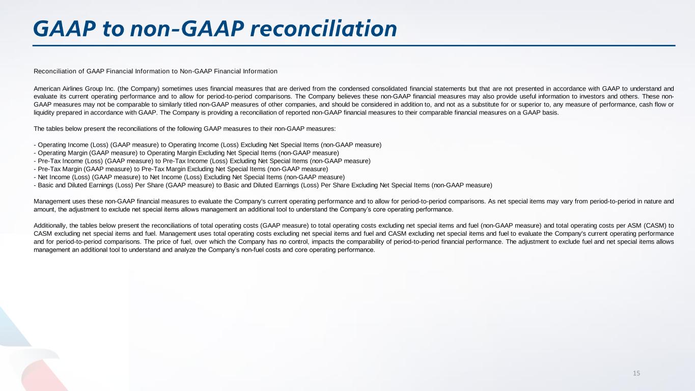 15 Reconciliation of GAAP Financial Information to Non-GAAP Financial Information American Airlines Group Inc. (the Company) sometimes uses financial measures that are derived from the condensed consolidated financial statements but that are not presented in accordance with GAAP to understand and evaluate its current operating performance and to allow for period-to-period comparisons. The Company believes these non-GAAP financial measures may also provide useful information to investors and others. These non- GAAP measures may not be comparable to similarly titled non-GAAP measures of other companies, and should be considered in addition to, and not as a substitute for or superior to, any measure of performance, cash flow or liquidity prepared in accordance with GAAP. The Company is providing a reconciliation of reported non-GAAP financial measures to their comparable financial measures on a GAAP basis. The tables below present the reconciliations of the following GAAP measures to their non-GAAP measures: - Operating Income (Loss) (GAAP measure) to Operating Income (Loss) Excluding Net Special Items (non-GAAP measure) - Operating Margin (GAAP measure) to Operating Margin Excluding Net Special Items (non-GAAP measure) - Pre-Tax Income (Loss) (GAAP measure) to Pre-Tax Income (Loss) Excluding Net Special Items (non-GAAP measure) - Pre-Tax Margin (GAAP measure) to Pre-Tax Margin Excluding Net Special Items (non-GAAP measure) - Net Income (Loss) (GAAP measure) to Net Income (Loss) Excluding Net Special Items (non-GAAP measure) - Basic and Diluted Earnings (Loss) Per Share (GAAP measure) to Basic and Diluted Earnings (Loss) Per Share Excluding Net Special Items (non-GAAP measure) Management uses these non-GAAP financial measures to evaluate the Company's current operating performance and to allow for period-to-period comparisons. As net special items may vary from period-to-period in nature and amount, the adjustment to exclude net special items allows management an additional tool to understand the Company’s core operating performance. Additionally, the tables below present the reconciliations of total operating costs (GAAP measure) to total operating costs excluding net special items and fuel (non-GAAP measure) and total operating costs per ASM (CASM) to CASM excluding net special items and fuel. Management uses total operating costs excluding net special items and fuel and CASM excluding net special items and fuel to evaluate the Company's current operating performance and for period-to-period comparisons. The price of fuel, over which the Company has no control, impacts the comparability of period-to-period financial performance. The adjustment to exclude fuel and net special items allows management an additional tool to understand and analyze the Company’s non-fuel costs and core operating performance.