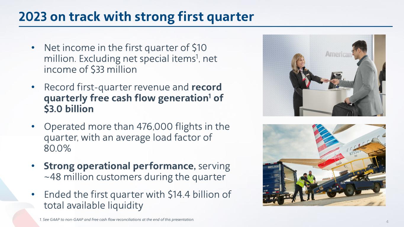 2023 on track with strong first quarter 4 • Net income in the first quarter of $10 million. Excluding net special items1, net income of $33 million • Record first-quarter revenue and record quarterly free cash flow generation1 of $3.0 billion • Operated more than 476,000 flights in the quarter, with an average load factor of 80.0% • Strong operational performance, serving ~48 million customers during the quarter • Ended the first quarter with $14.4 billion of total available liquidity 1. See GAAP to non-GAAP and free cash flow reconciliations at the end of this presentation.