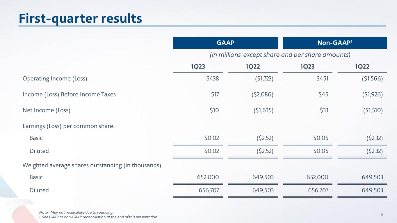 First-quarter results 8Note: May not recalculate due to rounding. 1. See GAAP to non-GAAP reconciliation at the end of this presentation. GAAP Non-GAAP1 (in millions, except share and per share amounts) 1Q23 1Q22 1Q23 1Q22 Operating Income (Loss) $438 ($1,723) $451 ($1,566) Income (Loss) Before Income Taxes $17 ($2,086) $45 ($1,926) Net Income (Loss) $10 ($1,635) $33 ($1,510) Earnings (Loss) per common share: Basic $0.02 ($2.52) $0.05 ($2.32) Diluted $0.02 ($2.52) $0.05 ($2.32) Weighted average shares outstanding (in thousands): Basic 652,000 649,503 652,000 649,503 Diluted 656,707 649,503 656,707 649,503
