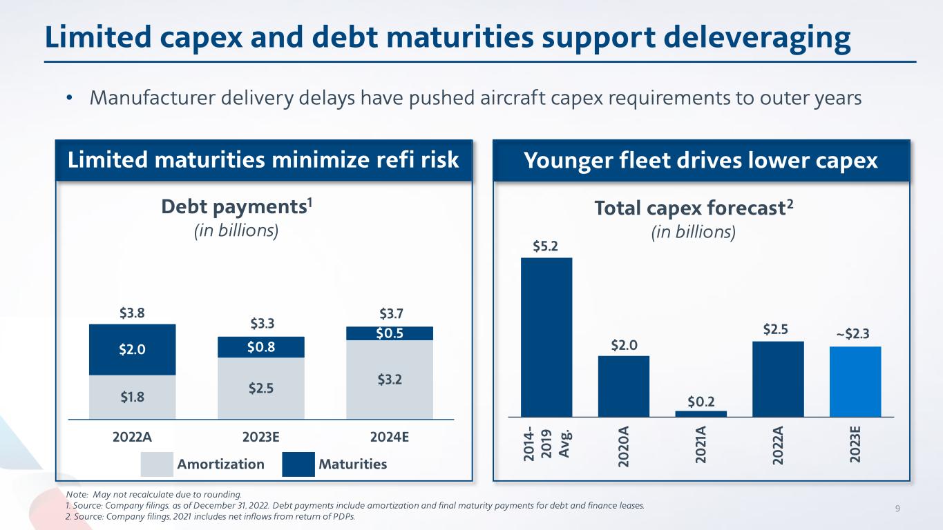 $1.8 $2.5 $3.2 $2.0 $0.8 $0.5 2022A 2023E 2024E Debt payments1 (in billions) Amortization Maturities $3.8 $3.3 $3.7 Limited capex and debt maturities support deleveraging Younger fleet drives lower capex Note: May not recalculate due to rounding. 1. Source: Company filings, as of December 31, 2022. Debt payments include amortization and final maturity payments for debt and finance leases. 2. Source: Company filings, 2021 includes net inflows from return of PDPs. 9 Limited maturities minimize refi risk $5.2 $2.0 $0.2 $2.5 ~$2.3 20 14 - 20 19 A vg . 20 20 A 20 21 A 20 22 A 20 23 E Total capex forecast2 (in billions) • Manufacturer delivery delays have pushed aircraft capex requirements to outer years