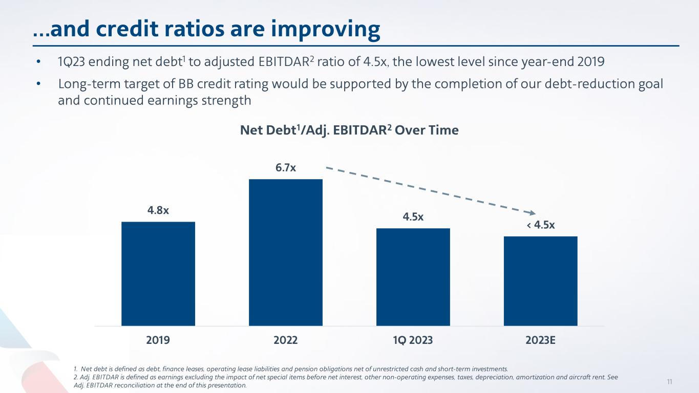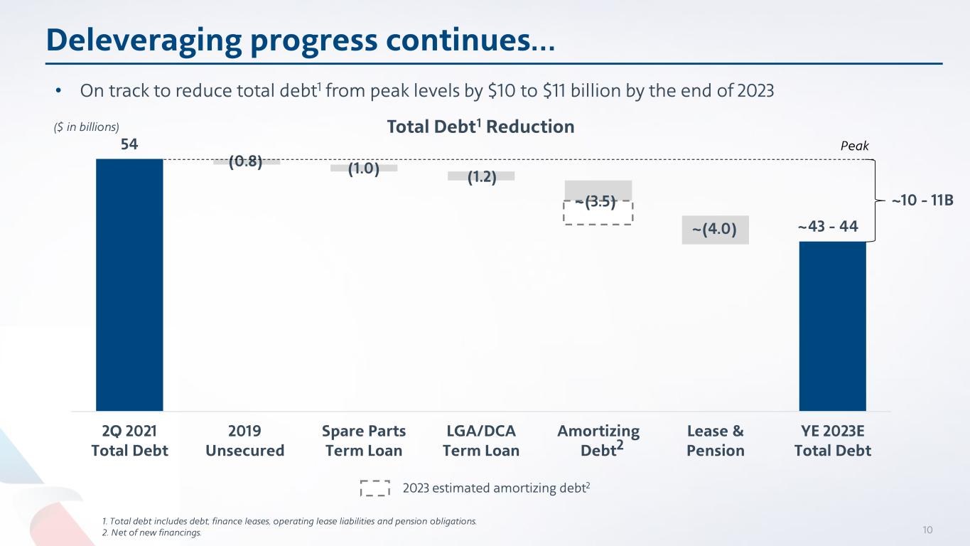 2Q 2021 Total Debt 2019 Unsecured Spare Parts Term Loan LGA/DCA Term Loan Amortizing Debt Lease & Pension YE 2023E Total Debt (1.0) (1.2) (0.8) Deleveraging progress continues… 10 ~10 - 11B 54 Peak • On track to reduce total debt1 from peak levels by $10 to $11 billion by the end of 2023 ($ in billions) ~43 - 44~(4.0) 1. Total debt includes debt, finance leases, operating lease liabilities and pension obligations. 2. Net of new financings. 2 ~(3.5) 2023 estimated amortizing debt2 Total Debt1 Reduction