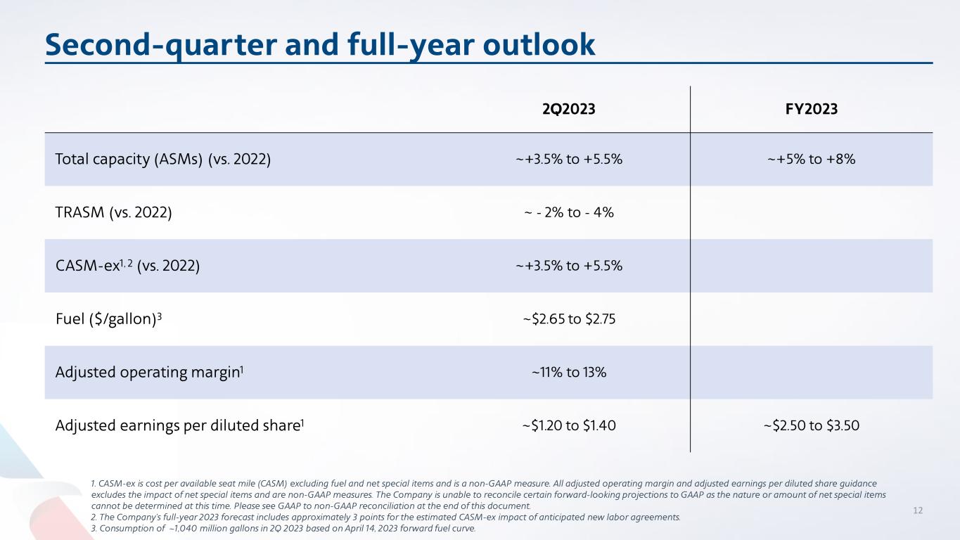 Second-quarter and full-year outlook 12 1. CASM-ex is cost per available seat mile (CASM) excluding fuel and net special items and is a non-GAAP measure. All adjusted operating margin and adjusted earnings per diluted share guidance excludes the impact of net special items and are non-GAAP measures. The Company is unable to reconcile certain forward-looking projections to GAAP as the nature or amount of net special items cannot be determined at this time. Please see GAAP to non-GAAP reconciliation at the end of this document. 2. The Company’s full-year 2023 forecast includes approximately 3 points for the estimated CASM-ex impact of anticipated new labor agreements. 3. Consumption of ~1,040 million gallons in 2Q 2023 based on April 14, 2023 forward fuel curve. 2Q2023 FY2023 Total capacity (ASMs) (vs. 2022) ~+3.5% to +5.5% ~+5% to +8% TRASM (vs. 2022) ~ - 2% to - 4% CASM-ex1, 2 (vs. 2022) ~+3.5% to +5.5% Fuel ($/gallon)3 ~$2.65 to $2.75 Adjusted operating margin1 ~11% to 13% Adjusted earnings per diluted share1 ~$1.20 to $1.40 ~$2.50 to $3.50