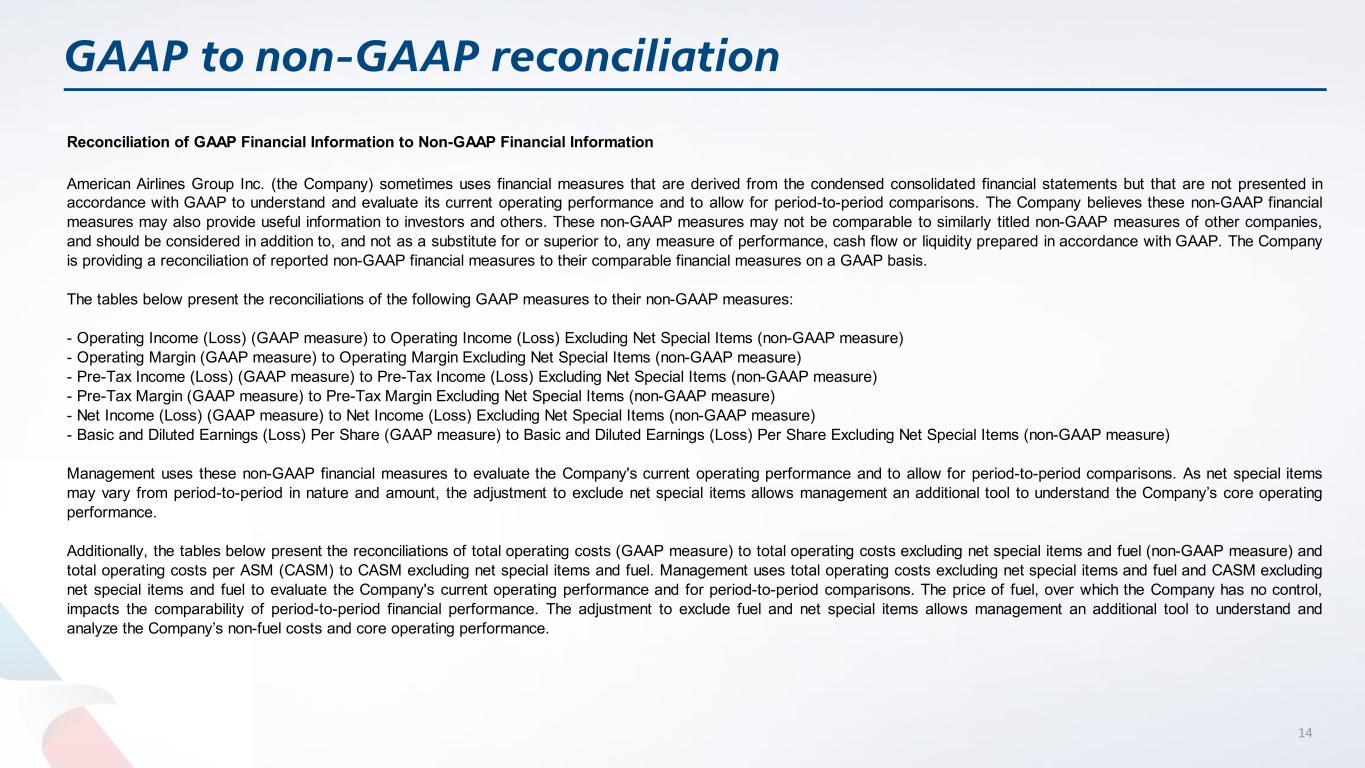 GAAP to non-GAAP reconciliation 14 Reconciliation of GAAP Financial Information to Non-GAAP Financial Information American Airlines Group Inc. (the Company) sometimes uses financial measures that are derived from the condensed consolidated financial statements but that are not presented in accordance with GAAP to understand and evaluate its current operating performance and to allow for period-to-period comparisons. The Company believes these non-GAAP financial measures may also provide useful information to investors and others. These non-GAAP measures may not be comparable to similarly titled non-GAAP measures of other companies, and should be considered in addition to, and not as a substitute for or superior to, any measure of performance, cash flow or liquidity prepared in accordance with GAAP. The Company is providing a reconciliation of reported non-GAAP financial measures to their comparable financial measures on a GAAP basis. The tables below present the reconciliations of the following GAAP measures to their non-GAAP measures: - Operating Income (Loss) (GAAP measure) to Operating Income (Loss) Excluding Net Special Items (non-GAAP measure) - Operating Margin (GAAP measure) to Operating Margin Excluding Net Special Items (non-GAAP measure) - Pre-Tax Income (Loss) (GAAP measure) to Pre-Tax Income (Loss) Excluding Net Special Items (non-GAAP measure) - Pre-Tax Margin (GAAP measure) to Pre-Tax Margin Excluding Net Special Items (non-GAAP measure) - Net Income (Loss) (GAAP measure) to Net Income (Loss) Excluding Net Special Items (non-GAAP measure) - Basic and Diluted Earnings (Loss) Per Share (GAAP measure) to Basic and Diluted Earnings (Loss) Per Share Excluding Net Special Items (non-GAAP measure) Management uses these non-GAAP financial measures to evaluate the Company's current operating performance and to allow for period-to-period comparisons. As net special items may vary from period-to-period in nature and amount, the adjustment to exclude net special items allows management an additional tool to understand the Company’s core operating performance. Additionally, the tables below present the reconciliations of total operating costs (GAAP measure) to total operating costs excluding net special items and fuel (non-GAAP measure) and total operating costs per ASM (CASM) to CASM excluding net special items and fuel. Management uses total operating costs excluding net special items and fuel and CASM excluding net special items and fuel to evaluate the Company's current operating performance and for period-to-period comparisons. The price of fuel, over which the Company has no control, impacts the comparability of period-to-period financial performance. The adjustment to exclude fuel and net special items allows management an additional tool to understand and analyze the Company’s non-fuel costs and core operating performance.