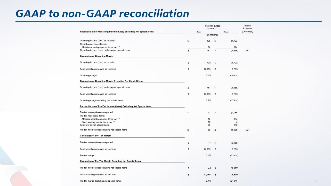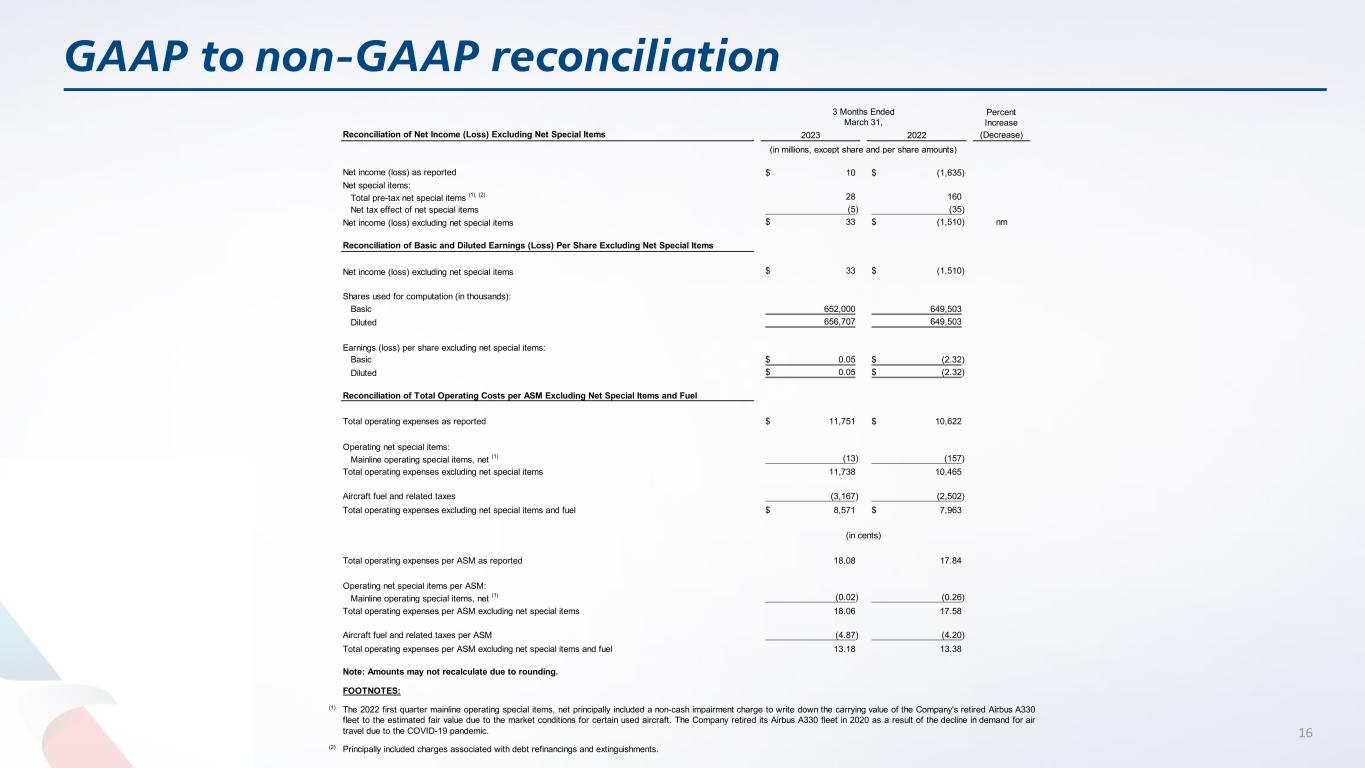 GAAP to non-GAAP reconciliation 15 Percent Increase Reconciliation of Operating Income (Loss) Excluding Net Special Items 2023 2022 (Decrease) Operating income (loss) as reported 438$ (1,723)$ Operating net special items: Mainline operating special items, net (1) 13 157 Operating income (loss) excluding net special items $ 451 $ (1,566) nm Calculation of Operating Margin Operating income (loss) as reported $ 438 $ (1,723) Total operating revenues as reported $ 12,189 $ 8,899 Operating margin 3.6% (19.4%) Calculation of Operating Margin Excluding Net Special Items Operating income (loss) excluding net special items $ 451 $ (1,566) Total operating revenues as reported $ 12,189 $ 8,899 Operating margin excluding net special items 3.7% (17.6%) Reconciliation of Pre-Tax Income (Loss) Excluding Net Special Items Pre-tax income (loss) as reported 17$ (2,086)$ Pre-tax net special items: Mainline operating special items, net (1) 13 157 Nonoperating special items, net (2) 15 3 Total pre-tax net special items 28 160 Pre-tax income (loss) excluding net special items 45$ (1,926)$ nm Calculation of Pre-Tax Margin Pre-tax income (loss) as reported $ 17 $ (2,086) Total operating revenues as reported $ 12,189 $ 8,899 Pre-tax margin 0.1% (23.4%) Calculation of Pre-Tax Margin Excluding Net Special Items Pre-tax income (loss) excluding net special items $ 45 $ (1,926) Total operating revenues as reported $ 12,189 $ 8,899 Pre-tax margin excluding net special items 0.4% (21.6%) 3 Months Ended March 31, (in millions)