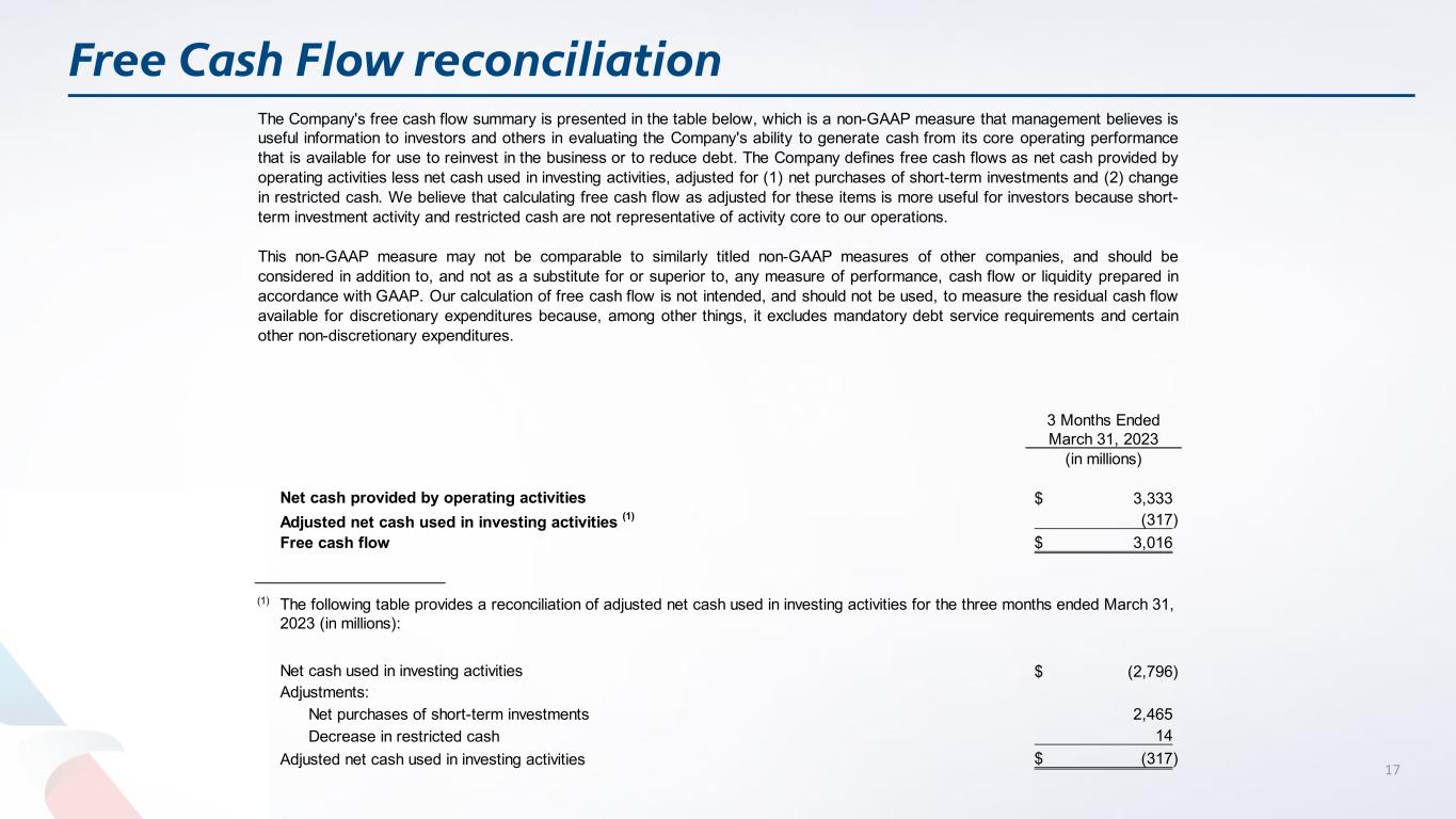 Free Cash Flow reconciliation 17 (in millions) 3,333$ (317) 3,016$ (1) (2,796)$ 2,465 14 (317)$ Adjusted net cash used in investing activities The following table provides a reconciliation of adjusted net cash used in investing activities for the three months ended March 31, 2023 (in millions): Net cash used in investing activities Adjustments: Net purchases of short-term investments Decrease in restricted cash Net cash provided by operating activities 3 Months Ended March 31, 2023 Free cash flow Adjusted net cash used in investing activities (1) The Company's free cash flow summary is presented in the table below, which is a non-GAAP measure that management believes is useful information to investors and others in evaluating the Company's ability to generate cash from its core operating performance that is available for use to reinvest in the business or to reduce debt. The Company defines free cash flows as net cash provided by operating activities less net cash used in investing activities, adjusted for (1) net purchases of short-term investments and (2) change in restricted cash. We believe that calculating free cash flow as adjusted for these items is more useful for investors because short- term investment activity and restricted cash are not representative of activity core to our operations. This non-GAAP measure may not be comparable to similarly titled non-GAAP measures of other companies, and should be considered in addition to, and not as a substitute for or superior to, any measure of performance, cash flow or liquidity prepared in accordance with GAAP. Our calculation of free cash flow is not intended, and should not be used, to measure the residual cash flow available for discretionary expenditures because, among other things, it excludes mandatory debt service requirements and certain other non-discretionary expenditures.