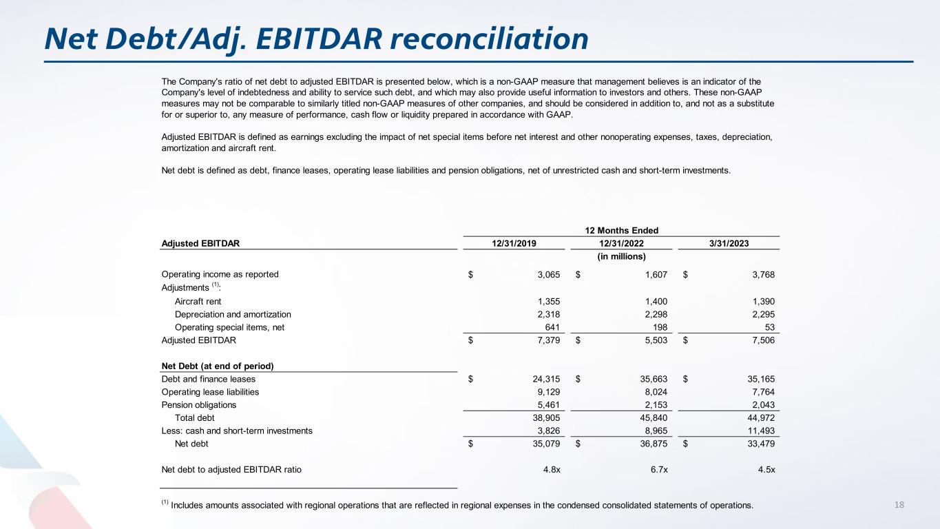 Net Debt/Adj. EBITDAR reconciliation 18 Adjusted EBITDAR 12/31/2019 12/31/2022 3/31/2023 (in millions) Operating income as reported 3,065$ 1,607$ 3,768$ Adjustments (1): Aircraft rent 1,355 1,400 1,390 Depreciation and amortization 2,318 2,298 2,295 Operating special items, net 641 198 53 Adjusted EBITDAR 7,379$ 5,503$ 7,506$ Net Debt (at end of period) Debt and finance leases 24,315$ 35,663$ 35,165$ Operating lease liabilities 9,129 8,024 7,764 Pension obligations 5,461 2,153 2,043 Total debt 38,905 45,840 44,972 Less: cash and short-term investments 3,826 8,965 11,493 Net debt 35,079$ 36,875$ 33,479$ Net debt to adjusted EBITDAR ratio 4.8x 6.7x 4.5x The Company's ratio of net debt to adjusted EBITDAR is presented below, which is a non-GAAP measure that management believes is an indicator of the Company's level of indebtedness and ability to service such debt, and which may also provide useful information to investors and others. These non-GAAP measures may not be comparable to similarly titled non-GAAP measures of other companies, and should be considered in addition to, and not as a substitute for or superior to, any measure of performance, cash flow or liquidity prepared in accordance with GAAP. Adjusted EBITDAR is defined as earnings excluding the impact of net special items before net interest and other nonoperating expenses, taxes, depreciation, amortization and aircraft rent. Net debt is defined as debt, finance leases, operating lease liabilities and pension obligations, net of unrestricted cash and short-term investments. 12 Months Ended (1) Includes amounts associated with regional operations that are reflected in regional expenses in the condensed consolidated statements of operations.