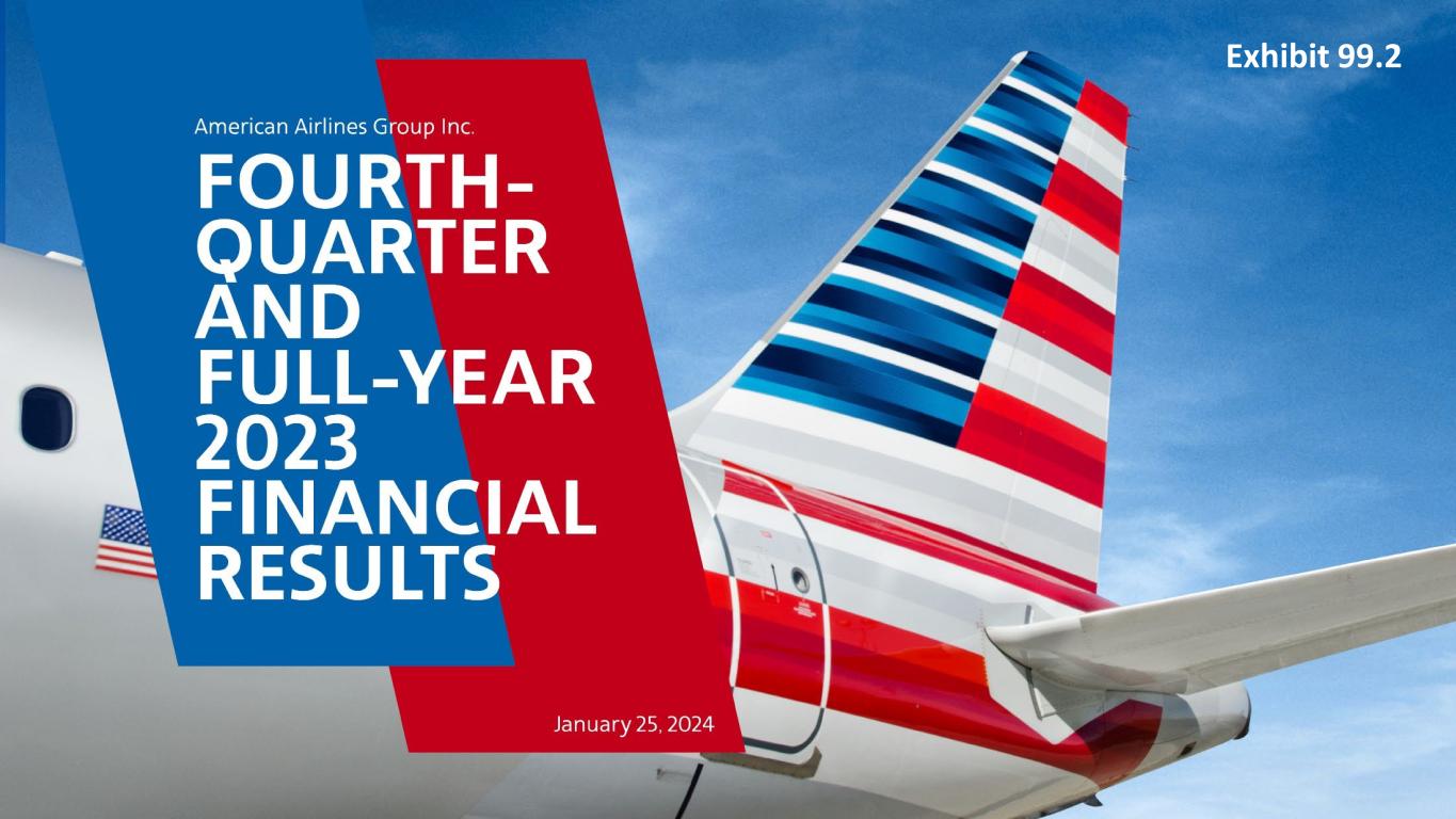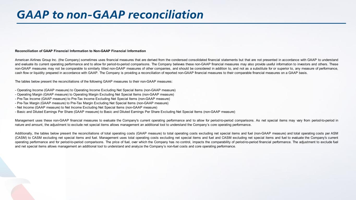 GAAP to non-GAAP reconciliation Reconciliation of GAAP Financial Information to Non-GAAP Financial Information American Airlines Group Inc. (the Company) sometimes uses financial measures that are derived from the condensed consolidated financial statements but that are not presented in accordance with GAAP to understand and evaluate its current operating performance and to allow for period-to-period comparisons. The Company believes these non-GAAP financial measures may also provide useful information to investors and others. These non-GAAP measures may not be comparable to similarly titled non-GAAP measures of other companies, and should be considered in addition to, and not as a substitute for or superior to, any measure of performance, cash flow or liquidity prepared in accordance with GAAP. The Company is providing a reconciliation of reported non-GAAP financial measures to their comparable financial measures on a GAAP basis. The tables below present the reconciliations of the following GAAP measures to their non-GAAP measures: - Operating Income (GAAP measure) to Operating Income Excluding Net Special Items (non-GAAP measure) - Operating Margin (GAAP measure) to Operating Margin Excluding Net Special Items (non-GAAP measure) - Pre-Tax Income (GAAP measure) to Pre-Tax Income Excluding Net Special Items (non-GAAP measure) - Pre-Tax Margin (GAAP measure) to Pre-Tax Margin Excluding Net Special Items (non-GAAP measure) - Net Income (GAAP measure) to Net Income Excluding Net Special Items (non-GAAP measure) - Basic and Diluted Earnings Per Share (GAAP measure) to Basic and Diluted Earnings Per Share Excluding Net Special Items (non-GAAP measure) Management uses these non-GAAP financial measures to evaluate the Company's current operating performance and to allow for period-to-period comparisons. As net special items may vary from period-to-period in nature and amount, the adjustment to exclude net special items allows management an additional tool to understand the Company’s core operating performance. Additionally, the tables below present the reconciliations of total operating costs (GAAP measure) to total operating costs excluding net special items and fuel (non-GAAP measure) and total operating costs per ASM (CASM) to CASM excluding net special items and fuel. Management uses total operating costs excluding net special items and fuel and CASM excluding net special items and fuel to evaluate the Company's current operating performance and for period-to-period comparisons. The price of fuel, over which the Company has no control, impacts the comparability of period-to-period financial performance. The adjustment to exclude fuel and net special items allows management an additional tool to understand and analyze the Company’s non-fuel costs and core operating performance.