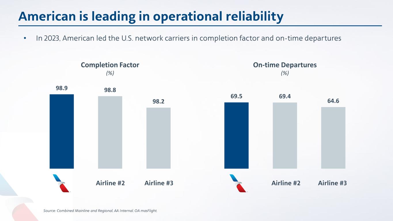 American is leading in operational reliability • In 2023, American led the U.S. network carriers in completion factor and on-time departures 98.9 98.8 98.2 69.5 69.4 64.6 Airline #2 Airline #3 Airline #2 Airline #3 Completion Factor (%) On-time Departures (%) Source: Combined Mainline and Regional, AA Internal, OA masFlight.