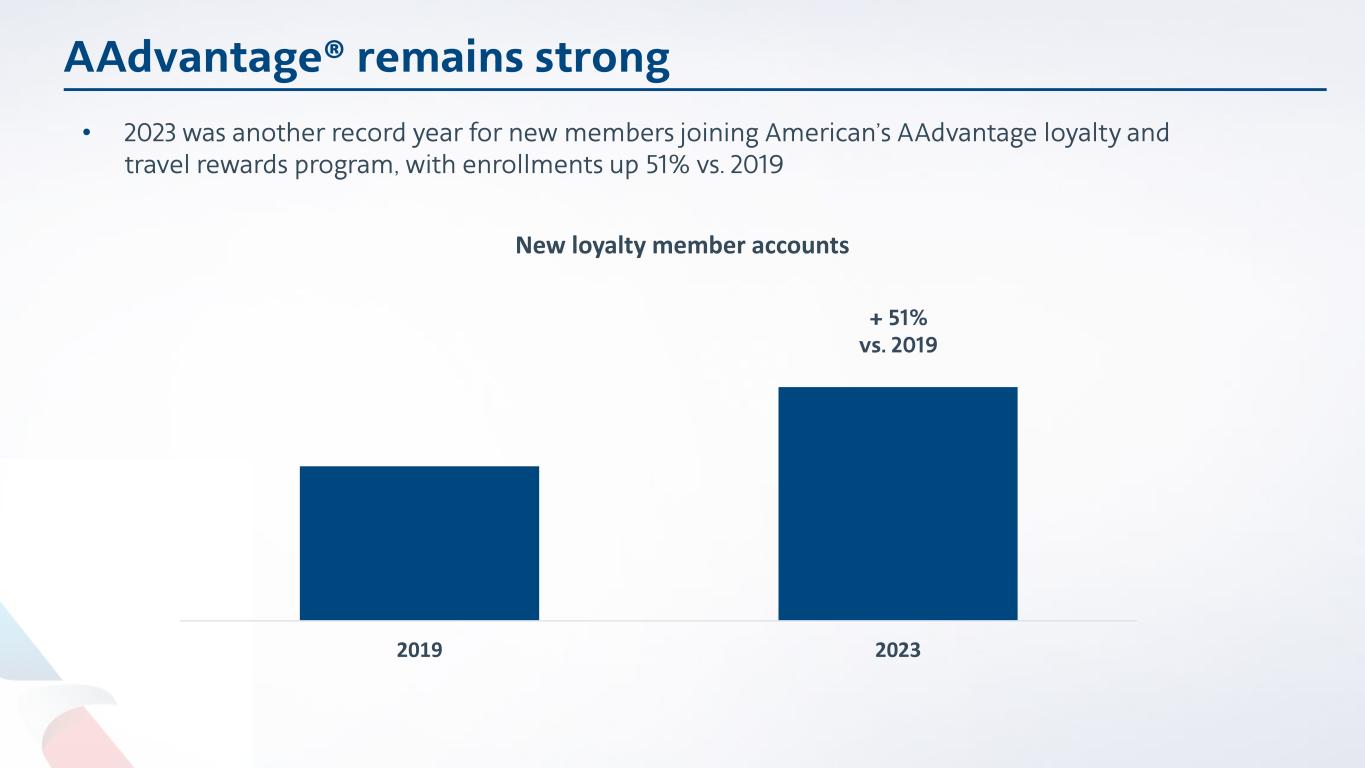 2019 2023 New loyalty member accounts AAdvantage® remains strong • 2023 was another record year for new members joining American’s AAdvantage loyalty and travel rewards program, with enrollments up 51% vs. 2019 + 51% vs. 2019