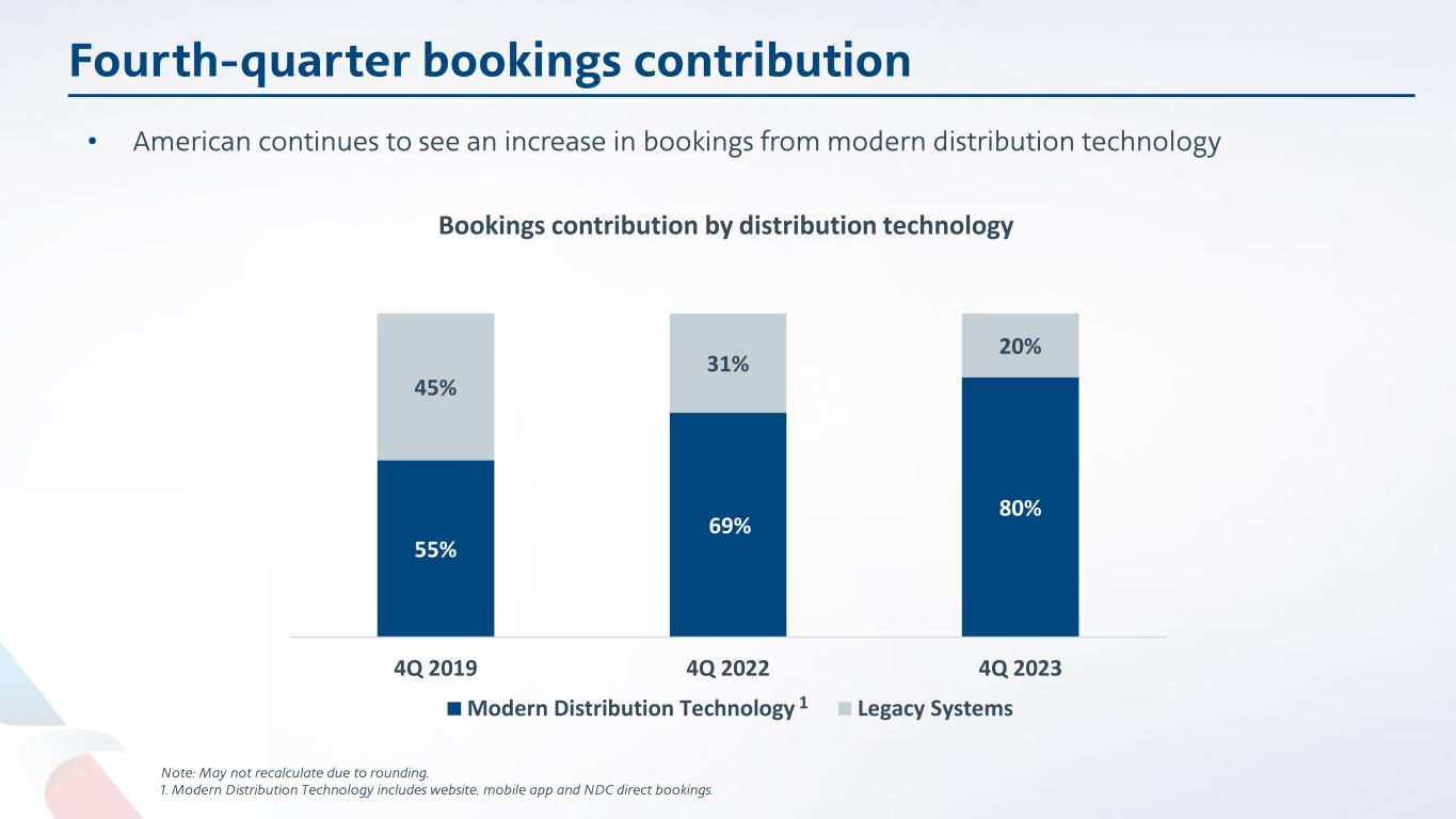 55% 69% 80% 45% 31% 20% 4Q 2019 4Q 2022 4Q 2023 Bookings contribution by distribution technology Modern Distribution Technology Legacy Systems Fourth-quarter bookings contribution • American continues to see an increase in bookings from modern distribution technology Note: May not recalculate due to rounding. 1. Modern Distribution Technology includes website, mobile app and NDC direct bookings. 1
