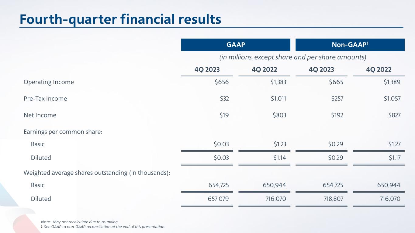 Fourth-quarter financial results Note: May not recalculate due to rounding. 1. See GAAP to non-GAAP reconciliation at the end of this presentation. GAAP Non-GAAP1 (in millions, except share and per share amounts) 4Q 2023 4Q 2022 4Q 2023 4Q 2022 Operating Income $656 $1,383 $665 $1,389 Pre-Tax Income $32 $1,011 $257 $1,057 Net Income $19 $803 $192 $827 Earnings per common share: Basic $0.03 $1.23 $0.29 $1.27 Diluted $0.03 $1.14 $0.29 $1.17 Weighted average shares outstanding (in thousands): Basic 654,725 650,944 654,725 650,944 Diluted 657,079 716,070 718,807 716,070