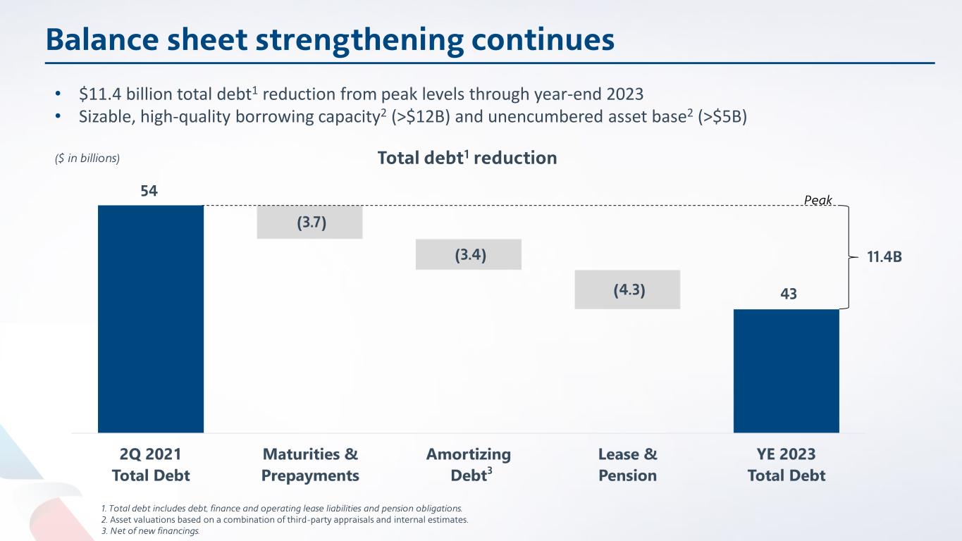 Balance sheet strengthening continues 11.4B Peak • $11.4 billion total debt1 reduction from peak levels through year-end 2023 • Sizable, high-quality borrowing capacity2 (>$12B) and unencumbered asset base2 (>$5B) ($ in billions) 1. Total debt includes debt, finance and operating lease liabilities and pension obligations. 2. Asset valuations based on a combination of third-party appraisals and internal estimates. 3. Net of new financings. 3 Total debt1 reduction 54 43