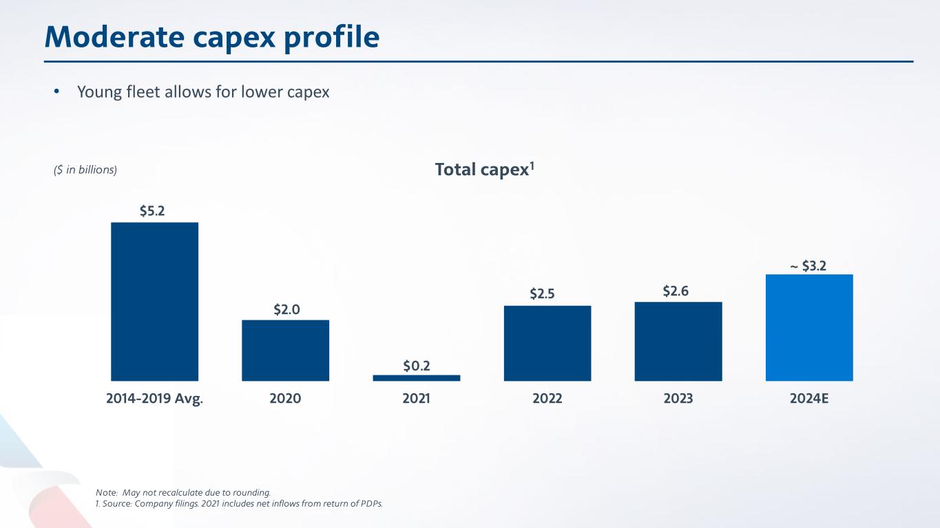 $5.2 $2.0 $0.2 $2.5 $2.6 ~ $3.2 2014-2019 Avg. 2020 2021 2022 2023 2024E Moderate capex profile Note: May not recalculate due to rounding. 1. Source: Company filings. 2021 includes net inflows from return of PDPs. • Young fleet allows for lower capex Total capex1($ in billions)