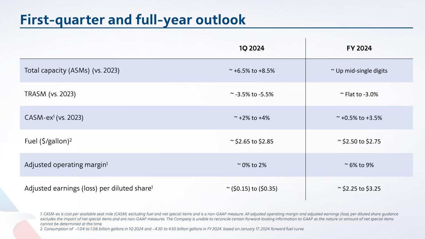 First-quarter and full-year outlook 1. CASM-ex is cost per available seat mile (CASM) excluding fuel and net special items and is a non-GAAP measure. All adjusted operating margin and adjusted earnings (loss) per diluted share guidance excludes the impact of net special items and are non-GAAP measures. The Company is unable to reconcile certain forward-looking information to GAAP as the nature or amount of net special items cannot be determined at this time. 2. Consumption of ~1.04 to 1.06 billion gallons in 1Q 2024 and ~4.30 to 4.50 billion gallons in FY 2024, based on January 17, 2024 forward fuel curve. 1Q 2024 FY 2024 Total capacity (ASMs) (vs. 2023) ~ +6.5% to +8.5% ~ Up mid-single digits TRASM (vs. 2023) ~ -3.5% to -5.5% ~ Flat to -3.0% CASM-ex1 (vs. 2023) ~ +2% to +4% ~ +0.5% to +3.5% Fuel ($/gallon)2 ~ $2.65 to $2.85 ~ $2.50 to $2.75 Adjusted operating margin1 ~ 0% to 2% ~ 6% to 9% Adjusted earnings (loss) per diluted share1 ~ ($0.15) to ($0.35) ~ $2.25 to $3.25