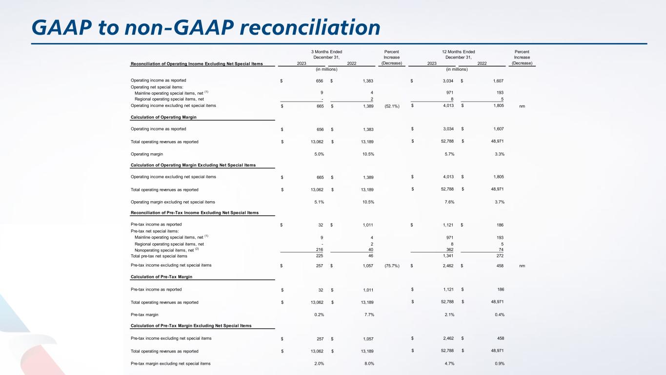 GAAP to non-GAAP reconciliation Percent Increase Percent Increase 2023 2022 (Decrease) 2023 2022 (Decrease) Operating income as reported 656$ 1,383$ 3,034$ 1,607$ Operating net special items: Mainline operating special items, net (1) 9 4 971 193 Regional operating special items, net - 2 8 5 Operating income excluding net special items $ 665 $ 1,389 (52.1%) $ 4,013 $ 1,805 nm Calculation of Operating Margin Operating income as reported $ 656 $ 1,383 $ 3,034 $ 1,607 Total operating revenues as reported $ 13,062 $ 13,189 $ 52,788 $ 48,971 Operating margin 5.0% 10.5% 5.7% 3.3% Calculation of Operating Margin Excluding Net Special Items Operating income excluding net special items $ 665 $ 1,389 $ 4,013 $ 1,805 Total operating revenues as reported $ 13,062 $ 13,189 $ 52,788 $ 48,971 Operating margin excluding net special items 5.1% 10.5% 7.6% 3.7% Reconciliation of Pre-Tax Income Excluding Net Special Items Pre-tax income as reported 32$ 1,011$ 1,121$ 186$ Pre-tax net special items: Mainline operating special items, net (1) 9 4 971 193 Regional operating special items, net - 2 8 5 Nonoperating special items, net (2) 216 40 362 74 Total pre-tax net special items 225 46 1,341 272 Pre-tax income excluding net special items 257$ 1,057$ (75.7%) 2,462$ 458$ nm Calculation of Pre-Tax Margin Pre-tax income as reported $ 32 $ 1,011 $ 1,121 $ 186 Total operating revenues as reported $ 13,062 $ 13,189 $ 52,788 $ 48,971 Pre-tax margin 0.2% 7.7% 2.1% 0.4% Calculation of Pre-Tax Margin Excluding Net Special Items Pre-tax income excluding net special items $ 257 $ 1,057 $ 2,462 $ 458 Total operating revenues as reported $ 13,062 $ 13,189 $ 52,788 $ 48,971 Pre-tax margin excluding net special items 2.0% 8.0% 4.7% 0.9% (in millions) (in millions) 12 Months Ended December 31, 3 Months Ended December 31, Reconciliation of Operating Income Excluding Net Special Items