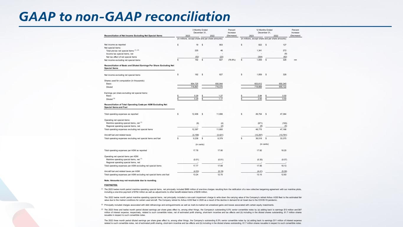 GAAP to non-GAAP reconciliation Percent Increase Percent Increase Reconciliation of Net Income Excluding Net Special Items 2023 2022 (Decrease) 2023 2022 (Decrease) Net income as reported 19$ 803$ 822$ 127$ Net special items: Total pre-tax net special items (1), (2) 225 46 1,341 272 Income tax special items, net - - - (9) Net tax effect of net special items (52) (22) (304) (62) Net income excluding net special items 192$ 827$ (76.8%) 1,859$ 328$ nm Reconciliation of Basic and Diluted Earnings Per Share Excluding Net Special Items Net income excluding net special items 192$ 827$ 1,859$ 328$ Shares used for computation (in thousands): Basic 654,725 650,944 653,612 650,345 Diluted 718,807 716,070 719,669 655,122 Earnings per share excluding net special items: Basic 0.29$ 1.27$ 2.84$ 0.50$ Diluted (3) 0.29$ 1.17$ 2.65$ 0.50$ Reconciliation of Total Operating Costs per ASM Excluding Net Special Items and Fuel Total operating expenses as reported 12,406$ 11,806$ 49,754$ 47,364$ Operating net special items: Mainline operating special items, net (1) (9) (4) (971) (193) Regional operating special items, net - (2) (8) (5) Total operating expenses excluding net special items 12,397 11,800 48,775 47,166 Aircraft fuel and related taxes (3,159) (3,421) (12,257) (13,791) Total operating expenses excluding net special items and fuel 9,238$ 8,379$ 36,518$ 33,375$ Total operating expenses per ASM as reported 17.78 17.90 17.92 18.20 Operating net special items per ASM: Mainline operating special items, net (1) (0.01) (0.01) (0.35) (0.07) Regional operating special items, net - - - - Total operating expenses per ASM excluding net special items 17.77 17.89 17.56 18.13 Aircraft fuel and related taxes per ASM (4.53) (5.19) (4.41) (5.30) Total operating expenses per ASM excluding net special items and fuel 13.24 12.70 13.15 12.83 Note: Amounts may not recalculate due to rounding. FOOTNOTES: (1) (2) (3) (in millions, except share and per share amounts) (in millions, except share and per share amounts) The 2023 three and twelve month period diluted earnings per share gives effect to, among other things, the Company's outstanding 6.5% senior convertible notes by (a) adding back to earnings $13 million and $47 million of interest expense, respectively, related to such convertible notes, net of estimated profit sharing, short-term incentive and tax effects and (b) including in the diluted shares outstanding, 61.7 million shares issuable in respect to such convertible notes. The 2022 three month period diluted earnings per share gives effect to, among other things, the Company's outstanding 6.5% senior convertible notes by (a) adding back to earnings $11 million of interest expense related to such convertible notes, net of estimated profit sharing, short-term incentive and tax effects and (b) including in the diluted shares outstanding, 61.7 million shares issuable in respect to such convertible notes. (in cents) Principally included charges associated with debt refinancings and extinguishments as well as mark-to-market net unrealized gains and losses associated with certain equity investments. (in cents) The 2023 twelve month period mainline operating special items, net principally included $989 million of one-time charges resulting from the ratification of a new collective bargaining agreement with our mainline pilots, including a one-time payment of $754 million as well as adjustments to other benefit-related items of $235 million. The 2022 twelve month period mainline operating special items, net principally included a non-cash impairment charge to write down the carrying value of the Company's retired Airbus A330 fleet to the estimated fair value due to the market conditions for certain used aircraft. The Company retired its Airbus A330 fleet in 2020 as a result of the decline in demand for air travel due to the COVID-19 pandemic. 3 Months Ended December 31, 12 Months Ended December 31,