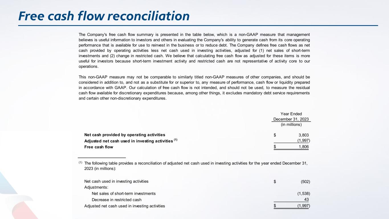 Free cash flow reconciliation (in millions) 3,803$ (1,997) 1,806$ (1) (502)$ (1,538) 43 (1,997)$ Net cash provided by operating activities Year Ended December 31, 2023 Free cash flow Adjusted net cash used in investing activities (1) The Company's free cash flow summary is presented in the table below, which is a non-GAAP measure that management believes is useful information to investors and others in evaluating the Company's ability to generate cash from its core operating performance that is available for use to reinvest in the business or to reduce debt. The Company defines free cash flows as net cash provided by operating activities less net cash used in investing activities, adjusted for (1) net sales of short-term investments and (2) change in restricted cash. We believe that calculating free cash flow as adjusted for these items is more useful for investors because short-term investment activity and restricted cash are not representative of activity core to our operations. This non-GAAP measure may not be comparable to similarly titled non-GAAP measures of other companies, and should be considered in addition to, and not as a substitute for or superior to, any measure of performance, cash flow or liquidity prepared in accordance with GAAP. Our calculation of free cash flow is not intended, and should not be used, to measure the residual cash flow available for discretionary expenditures because, among other things, it excludes mandatory debt service requirements and certain other non-discretionary expenditures. Adjusted net cash used in investing activities The following table provides a reconciliation of adjusted net cash used in investing activities for the year ended December 31, 2023 (in millions): Net cash used in investing activities Adjustments: Net sales of short-term investments Decrease in restricted cash