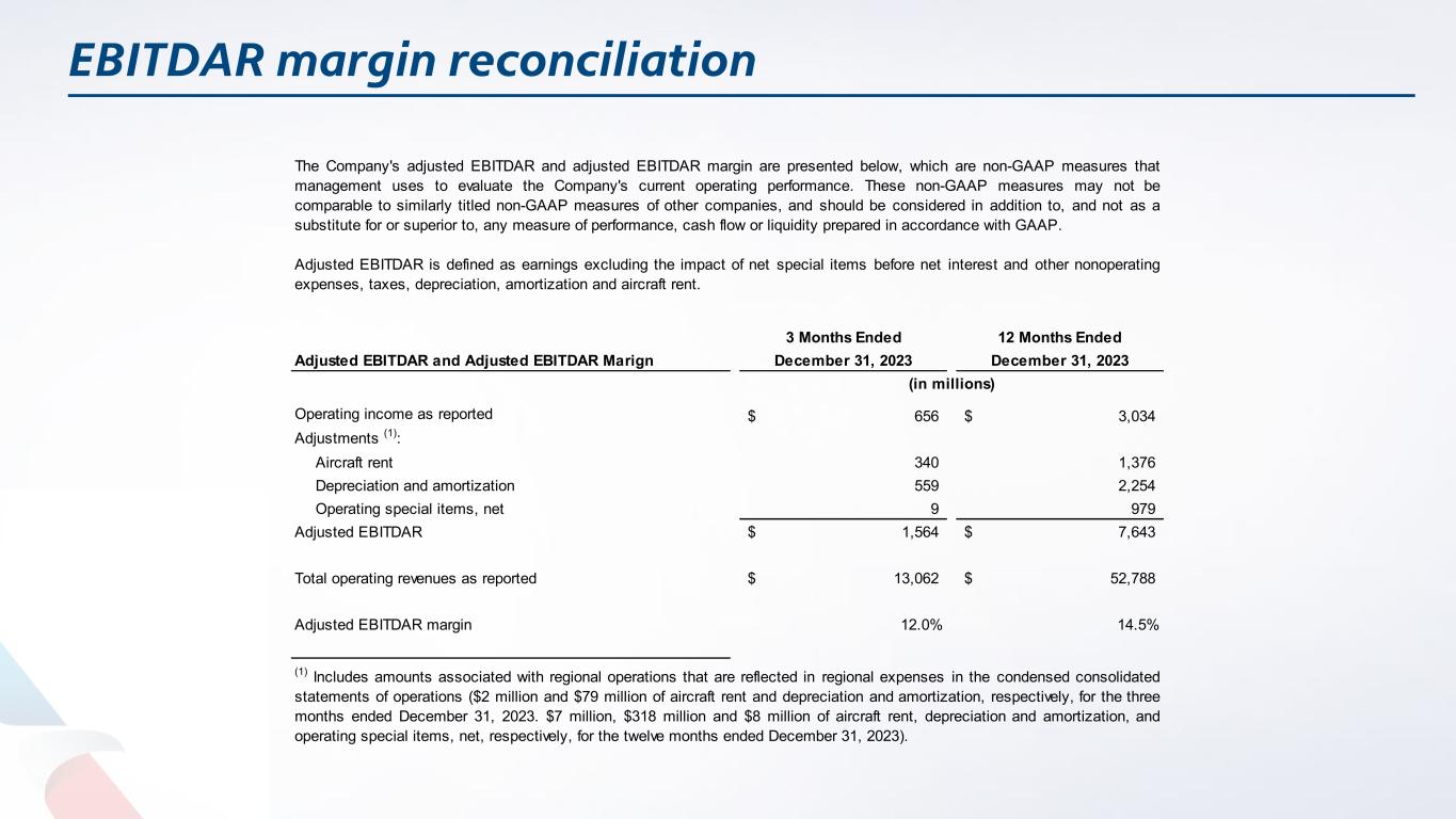 EBITDAR margin reconciliation 3 Months Ended 12 Months Ended Adjusted EBITDAR and Adjusted EBITDAR Marign December 31, 2023 December 31, 2023 Operating income as reported 656$ 3,034$ Adjustments (1): Aircraft rent 340 1,376 Depreciation and amortization 559 2,254 Operating special items, net 9 979 Adjusted EBITDAR 1,564$ 7,643$ Total operating revenues as reported 13,062$ 52,788$ Adjusted EBITDAR margin 12.0% 14.5% The Company's adjusted EBITDAR and adjusted EBITDAR margin are presented below, which are non-GAAP measures that management uses to evaluate the Company's current operating performance. These non-GAAP measures may not be comparable to similarly titled non-GAAP measures of other companies, and should be considered in addition to, and not as a substitute for or superior to, any measure of performance, cash flow or liquidity prepared in accordance with GAAP. Adjusted EBITDAR is defined as earnings excluding the impact of net special items before net interest and other nonoperating expenses, taxes, depreciation, amortization and aircraft rent. (in millions) (1) Includes amounts associated with regional operations that are reflected in regional expenses in the condensed consolidated statements of operations ($2 million and $79 million of aircraft rent and depreciation and amortization, respectively, for the three months ended December 31, 2023. $7 million, $318 million and $8 million of aircraft rent, depreciation and amortization, and operating special items, net, respectively, for the twelve months ended December 31, 2023).