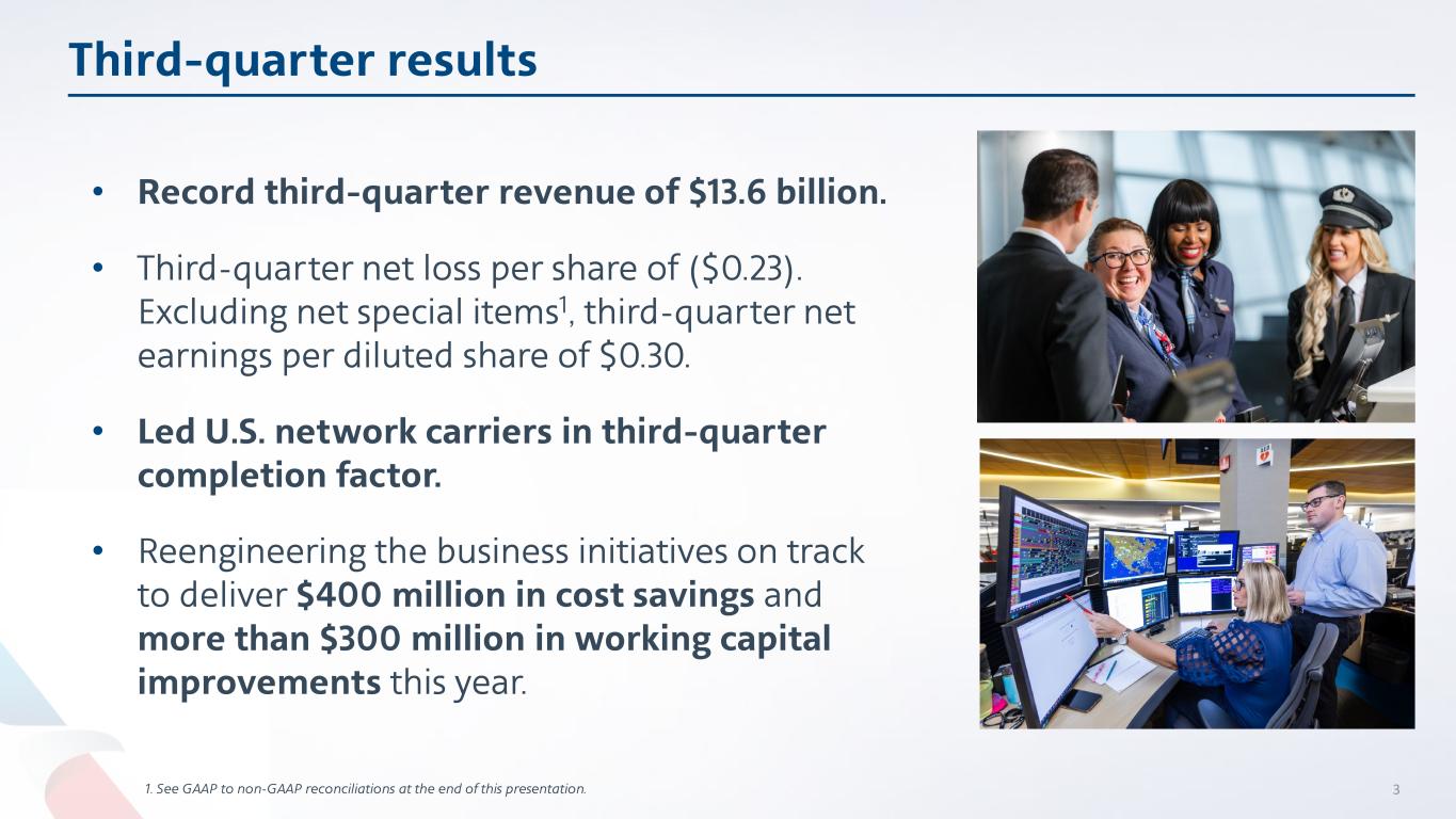 Third-quarter results • Record third-quarter revenue of $13.6 billion. • Third-quarter net loss per share of ($0.23). Excluding net special items1, third-quarter net earnings per diluted share of $0.30. • Led U.S. network carriers in third-quarter completion factor. • Reengineering the business initiatives on track to deliver $400 million in cost savings and more than $300 million in working capital improvements this year. 1. See GAAP to non-GAAP reconciliations at the end of this presentation. 3