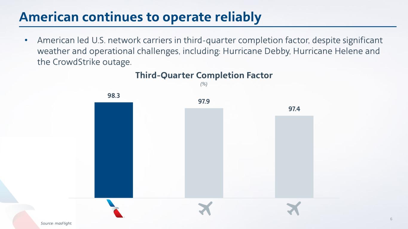 American continues to operate reliably • American led U.S. network carriers in third-quarter completion factor, despite significant weather and operational challenges, including: Hurricane Debby, Hurricane Helene and the CrowdStrike outage. Third-Quarter Completion Factor (%) 6 98.3 97.9 97.4 . Source: masFlight.