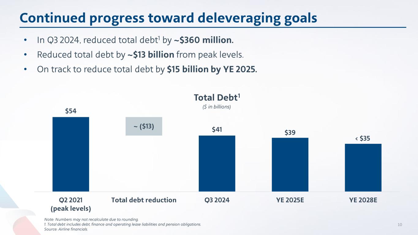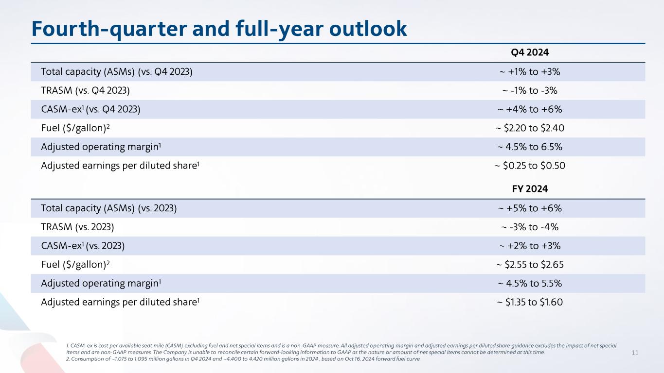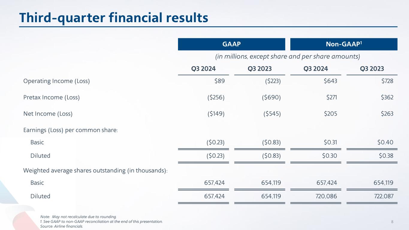Third-quarter financial results Note: May not recalculate due to rounding. 1. See GAAP to non-GAAP reconciliation at the end of this presentation. Source: Airline financials. GAAP Non-GAAP1 (in millions, except share and per share amounts) Q3 2024 Q3 2023 Q3 2024 Q3 2023 Operating Income (Loss) $89 ($223) $643 $728 Pretax Income (Loss) ($256) ($690) $271 $362 Net Income (Loss) ($149) ($545) $205 $263 Earnings (Loss) per common share: Basic ($0.23) ($0.83) $0.31 $0.40 Diluted ($0.23) ($0.83) $0.30 $0.38 Weighted average shares outstanding (in thousands): Basic 657,424 654,119 657,424 654,119 Diluted 657,424 654,119 720,086 722,087 8
