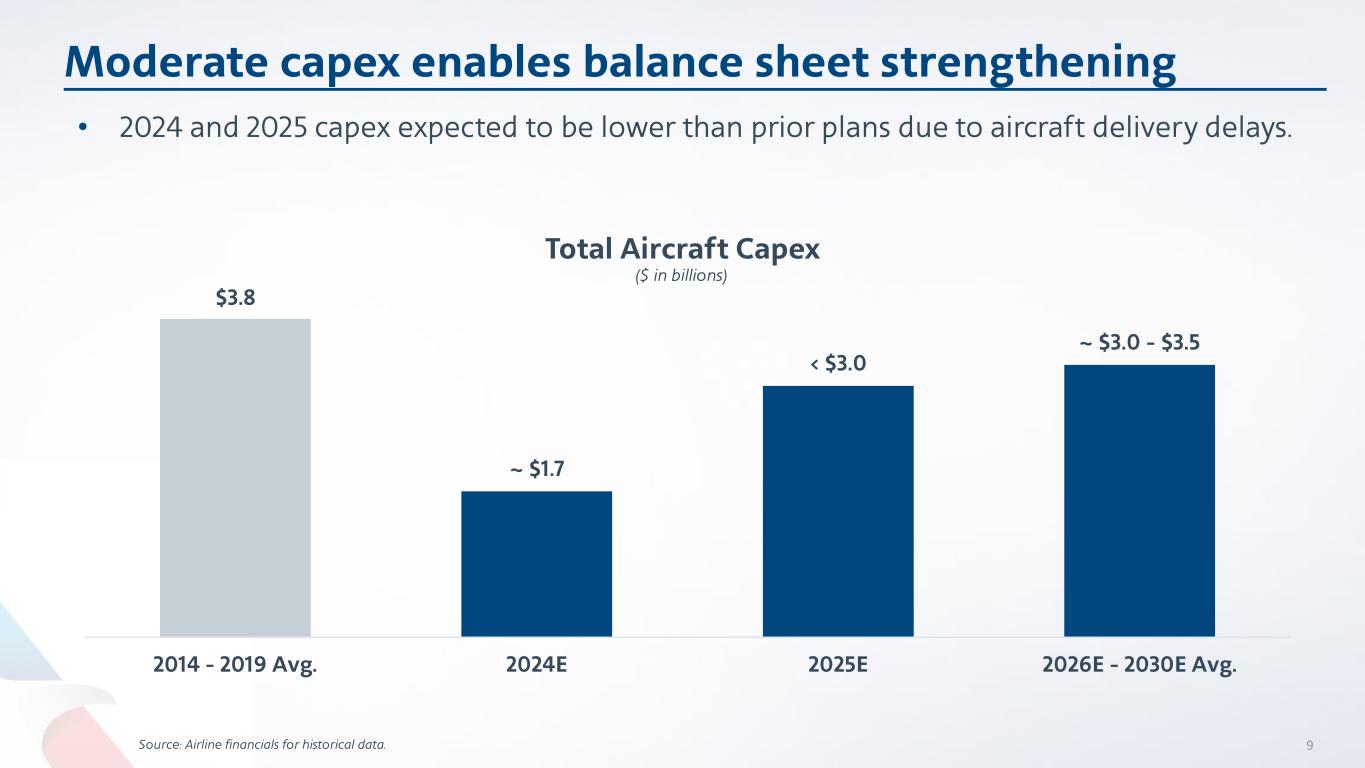 $3.8 ~ $1.7 < $3.0 ~ $3.0 - $3.5 2014 - 2019 Avg. 2024E 2025E 2026E - 2030E Avg. Moderate capex enables balance sheet strengthening Source: Airline financials for historical data. Total Aircraft Capex ($ in billions) • 2024 and 2025 capex expected to be lower than prior plans due to aircraft delivery delays. 9