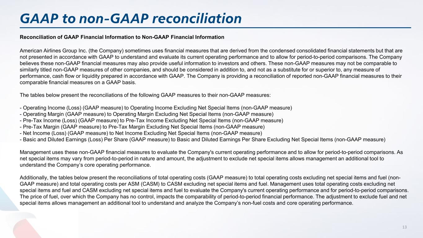 GAAP to non-GAAP reconciliation Reconciliation of GAAP Financial Information to Non-GAAP Financial Information American Airlines Group Inc. (the Company) sometimes uses financial measures that are derived from the condensed consolidated financial statements but that are not presented in accordance with GAAP to understand and evaluate its current operating performance and to allow for period-to-period comparisons. The Company believes these non-GAAP financial measures may also provide useful information to investors and others. These non-GAAP measures may not be comparable to similarly titled non-GAAP measures of other companies, and should be considered in addition to, and not as a substitute for or superior to, any measure of performance, cash flow or liquidity prepared in accordance with GAAP. The Company is providing a reconciliation of reported non-GAAP financial measures to their comparable financial measures on a GAAP basis. The tables below present the reconciliations of the following GAAP measures to their non-GAAP measures: - Operating Income (Loss) (GAAP measure) to Operating Income Excluding Net Special Items (non-GAAP measure) - Operating Margin (GAAP measure) to Operating Margin Excluding Net Special Items (non-GAAP measure) - Pre-Tax Income (Loss) (GAAP measure) to Pre-Tax Income Excluding Net Special Items (non-GAAP measure) - Pre-Tax Margin (GAAP measure) to Pre-Tax Margin Excluding Net Special Items (non-GAAP measure) - Net Income (Loss) (GAAP measure) to Net Income Excluding Net Special Items (non-GAAP measure) - Basic and Diluted Earnings (Loss) Per Share (GAAP measure) to Basic and Diluted Earnings Per Share Excluding Net Special Items (non-GAAP measure) Management uses these non-GAAP financial measures to evaluate the Company's current operating performance and to allow for period-to-period comparisons. As net special items may vary from period-to-period in nature and amount, the adjustment to exclude net special items allows management an additional tool to understand the Company’s core operating performance. Additionally, the tables below present the reconciliations of total operating costs (GAAP measure) to total operating costs excluding net special items and fuel (non- GAAP measure) and total operating costs per ASM (CASM) to CASM excluding net special items and fuel. Management uses total operating costs excluding net special items and fuel and CASM excluding net special items and fuel to evaluate the Company's current operating performance and for period-to-period comparisons. The price of fuel, over which the Company has no control, impacts the comparability of period-to-period financial performance. The adjustment to exclude fuel and net special items allows management an additional tool to understand and analyze the Company’s non-fuel costs and core operating performance. 13