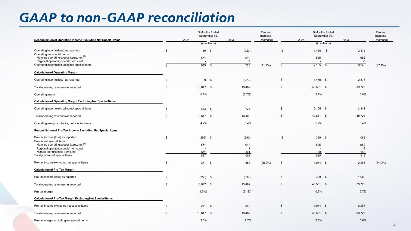 GAAP to non-GAAP reconciliation Reconciliation of Operating Income Excluding Net Special Items 3 Months Ended September 30, Percent Increase 9 Months Ended September 30, Percent Increase 2024 2023 (Decrease) 2024 2023 (Decrease) (in millions) (in millions) Operating income (loss) as reported $ 89 $ (223) $ 1,480 $ 2,378 Operating net special items: Mainline operating special items, net (1) 554 949 625 962 Regional operating special items, net - 2 - 8 Operating income excluding net special items $ 643 $ 728 (11.7%) $ 2,105 $ 3,348 (37.1%) Calculation of Operating Margin Operating income (loss) as reported $ 89 $ (223) $ 1,480 $ 2,378 Total operating revenues as reported $ 13,647 $ 13,482 $ 40,551 $ 39,726 Operating margin 0.7% (1.7%) 3.7% 6.0% Calculation of Operating Margin Excluding Net Special Items Operating income excluding net special items $ 643 $ 728 $ 2,105 $ 3,348 Total operating revenues as reported $ 13,647 $ 13,482 $ 40,551 $ 39,726 Operating margin excluding net special items 4.7% 5.4% 5.2% 8.4% Reconciliation of Pre-Tax Income Excluding Net Special Items Pre-tax income (loss) as reported $ (256) $ (690) $ 359 $ 1,089 Pre-tax net special items: Mainline operating special items, net (1) 554 949 625 962 Regional operating special items, net - 2 - 8 Nonoperating special items, net (2) (27) 101 30 146 Total pre-tax net special items 527 1,052 655 1,116 Pre-tax income excluding net special items $ 271 $ 362 (25.2%) $ 1,014 $ 2,205 (54.0%) Calculation of Pre-Tax Margin Pre-tax income (loss) as reported $ (256) $ (690) $ 359 $ 1,089 Total operating revenues as reported $ 13,647 $ 13,482 $ 40,551 $ 39,726 Pre-tax margin (1.9%) (5.1%) 0.9% 2.7% Calculation of Pre-Tax Margin Excluding Net Special Items Pre-tax income excluding net special items $ 271 $ 362 $ 1,014 $ 2,205 Total operating revenues as reported $ 13,647 $ 13,482 $ 40,551 $ 39,726 Pre-tax margin excluding net special items 2.0% 2.7% 2.5% 5.6% 14