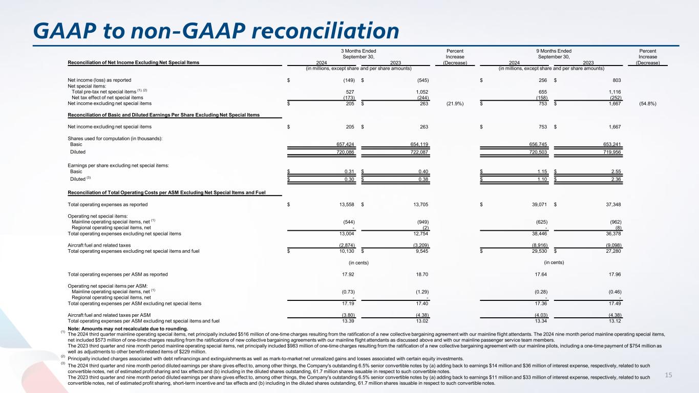 GAAP to non-GAAP reconciliation 3 Months Ended September 30, Percent Increase 9 Months Ended September 30, Percent Increase Reconciliation of Net Income Excluding Net Special Items 2024 2023 (Decrease) 2024 2023 (Decrease) (in millions, except share and per share amounts) (in millions, except share and per share amounts) Net income (loss) as reported $ (149) $ (545) $ 256 $ 803 Net special items: Total pre-tax net special items (1), (2) 527 1,052 655 1,116 Net tax effect of net special items (173) (244) (158) (252) Net income excluding net special items $ 205 $ 263 (21.9%) $ 753 $ 1,667 (54.8%) Reconciliation of Basic and Diluted Earnings Per Share Excluding Net Special Items Net income excluding net special items $ 205 $ 263 $ 753 $ 1,667 Shares used for computation (in thousands): Basic 657,424 654,119 656,745 653,241 Diluted 720,086 722,087 720,503 719,956 Earnings per share excluding net special items: Basic $ 0.31 $ 0.40 $ 1.15 $ 2.55 Diluted (3) $ 0.30 $ 0.38 $ 1.10 $ 2.36 Reconciliation of Total Operating Costs per ASM Excluding Net Special Items and Fuel Total operating expenses as reported $ 13,558 $ 13,705 $ 39,071 $ 37,348 Operating net special items: Mainline operating special items, net (1) (544) (949) (625) (962) Regional operating special items, net - (2) - (8) Total operating expenses excluding net special items 13,004 12,754 38,446 36,378 Aircraft fuel and related taxes (2,874) (3,209) (8,916) (9,098) Total operating expenses excluding net special items and fuel $ 10,130 $ 9,545 $ 29,530 $ 27,280 (in cents) (in cents) Total operating expenses per ASM as reported 17.92 18.70 17.64 17.96 Operating net special items per ASM: Mainline operating special items, net (1) (0.73) (1.29) (0.28) (0.46) Regional operating special items, net - - - - Total operating expenses per ASM excluding net special items 17.19 17.40 17.36 17.49 Aircraft fuel and related taxes per ASM (3.80) (4.38) (4.03) (4.38) Total operating expenses per ASM excluding net special items and fuel 13.39 13.02 13.34 13.12 Note: Amounts may not recalculate due to rounding. (1) The 2024 third quarter mainline operating special items, net principally included $516 million of one-time charges resulting from the ratification of a new collective bargaining agreement with our mainline flight attendants. The 2024 nine month period mainline operating special items, net included $573 million of one-time charges resulting from the ratifications of new collective bargaining agreements with our mainline flight attendants as discussed above and with our mainline passenger service team members. The 2023 third quarter and nine month period mainline operating special items, net principally included $983 million of one-time charges resulting from the ratification of a new collective bargaining agreement with our mainline pilots, including a one-time payment of $754 million as well as adjustments to other benefit-related items of $229 million. (2) Principally included charges associated with debt refinancings and extinguishments as well as mark-to-market net unrealized gains and losses associated with certain equity investments. (3) The 2024 third quarter and nine month period diluted earnings per share gives effect to, among other things, the Company's outstanding 6.5% senior convertible notes by (a) adding back to earnings $14 million and $36 million of interest expense, respectively, related to such convertible notes, net of estimated profit sharing and tax effects and (b) including in the diluted shares outstanding, 61.7 million shares issuable in respect to such convertible notes. The 2023 third quarter and nine month period diluted earnings per share gives effect to, among other things, the Company's outstanding 6.5% senior convertible notes by (a) adding back to earnings $11 million and $33 million of interest expense, respectively, related to such convertible notes, net of estimated profit sharing, short-term incentive and tax effects and (b) including in the diluted shares outstanding, 61.7 million shares issuable in respect to such convertible notes. 15