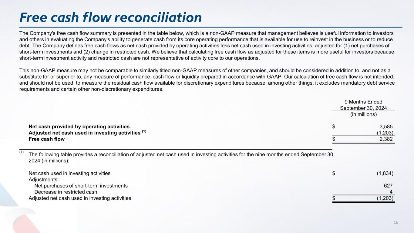 Free cash flow reconciliation The Company's free cash flow summary is presented in the table below, which is a non-GAAP measure that management believes is useful information to investors and others in evaluating the Company's ability to generate cash from its core operating performance that is available for use to reinvest in the business or to reduce debt. The Company defines free cash flows as net cash provided by operating activities less net cash used in investing activities, adjusted for (1) net purchases of short-term investments and (2) change in restricted cash. We believe that calculating free cash flow as adjusted for these items is more useful for investors because short-term investment activity and restricted cash are not representative of activity core to our operations. This non-GAAP measure may not be comparable to similarly titled non-GAAP measures of other companies, and should be considered in addition to, and not as a substitute for or superior to, any measure of performance, cash flow or liquidity prepared in accordance with GAAP. Our calculation of free cash flow is not intended, and should not be used, to measure the residual cash flow available for discretionary expenditures because, among other things, it excludes mandatory debt service requirements and certain other non-discretionary expenditures. 9 Months Ended September 30, 2024 (in millions) Net cash provided by operating activities $ 3,585 Adjusted net cash used in investing activities (1) (1,203) Free cash flow $ 2,382 (1) The following table provides a reconciliation of adjusted net cash used in investing activities for the nine months ended September 30, 2024 (in millions): Net cash used in investing activities $ (1,834) Adjustments: Net purchases of short-term investments 627 Decrease in restricted cash 4 Adjusted net cash used in investing activities $ (1,203) 16
