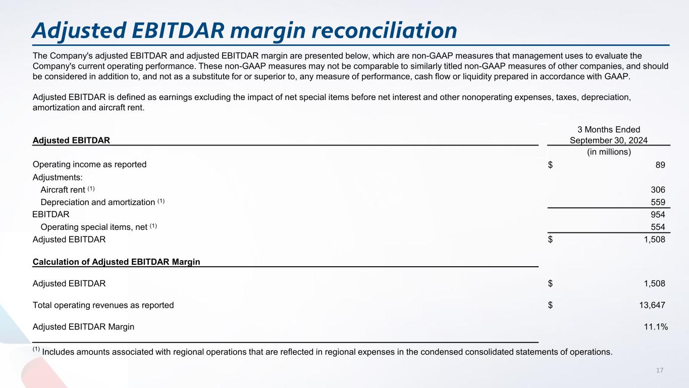 Adjusted EBITDAR margin reconciliation The Company's adjusted EBITDAR and adjusted EBITDAR margin are presented below, which are non-GAAP measures that management uses to evaluate the Company's current operating performance. These non-GAAP measures may not be comparable to similarly titled non-GAAP measures of other companies, and should be considered in addition to, and not as a substitute for or superior to, any measure of performance, cash flow or liquidity prepared in accordance with GAAP. Adjusted EBITDAR is defined as earnings excluding the impact of net special items before net interest and other nonoperating expenses, taxes, depreciation, amortization and aircraft rent. 3 Months Ended Adjusted EBITDAR September 30, 2024 (in millions) Operating income as reported $ 89 Adjustments: Aircraft rent (1) 306 Depreciation and amortization (1) 559 EBITDAR 954 Operating special items, net (1) 554 Adjusted EBITDAR $ 1,508 Calculation of Adjusted EBITDAR Margin Adjusted EBITDAR $ 1,508 Total operating revenues as reported $ 13,647 Adjusted EBITDAR Margin 11.1% (1) Includes amounts associated with regional operations that are reflected in regional expenses in the condensed consolidated statements of operations. 17