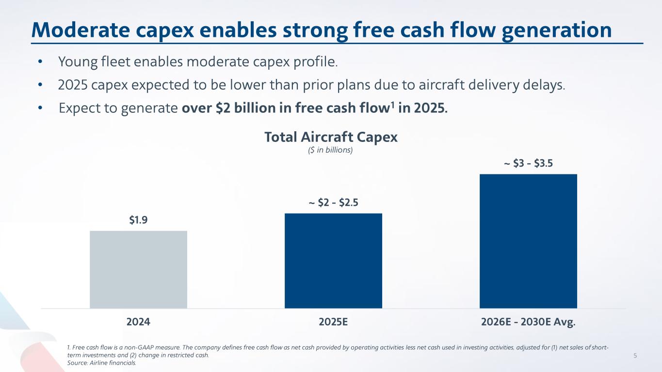 Fourth-quarter financial results Note: May not recalculate due to rounding. 1. See GAAP to non-GAAP reconciliation at the end of this presentation. Source: Airline financials. GAAP Non-GAAP1 (in millions, except share and per share amounts) Q4 2024 Q4 2023 Q4 2024 Q4 2023 Operating income $1,134 $656 $1,153 $665 Pretax income $795 $32 $808 $257 Net income $590 $19 $609 $192 Earnings per common share: Basic $0.90 $0.03 $0.93 $0.29 Diluted $0.84 $0.03 $0.86 $0.29 Weighted average shares outstanding (in thousands): Basic 657,746 654,725 657,746 654,725 Diluted 723,690 657,079 723,690 718,807 4
