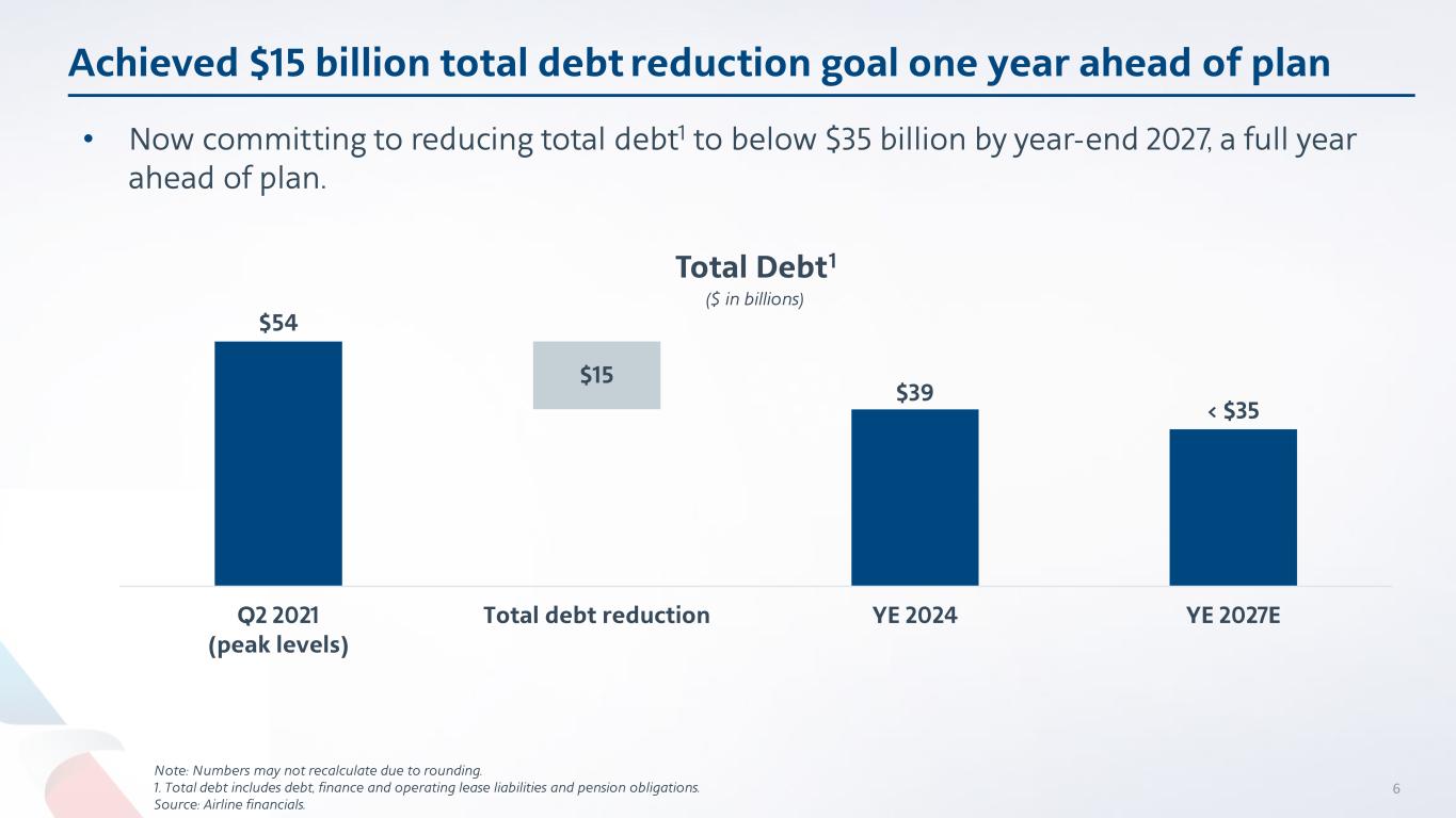 Strong fourth-quarter and full-year results • Achieved $15 billion total debt1 reduction goal a full year ahead of schedule. • Generated $4 billion in full-year operating cash flow and record full-year free cash flow2 of $2.2 billion. • Record full-year revenue of $54 billion. • Fourth-quarter GAAP earnings per diluted share of $0.84 and full-year earnings per diluted share of $1.24. • Excluding net special items2, fourth-quarter earnings per diluted share of $0.86 and full-year earnings per diluted share of $1.96. • Achieved nearly $500 million in cost savings in 2024, $100 million more than target. 1. Total debt includes debt, finance and operating lease liabilities and pension obligations. 2. See GAAP to non-GAAP and free cash flow reconciliations at the end of this presentation. Full-year 2024 free cash flow is inclusive of a one-time cash payment related to the new co-branded credit card agreement announced in December 2024. This one-time payment will be amortized over the life of the new agreement beginning in 2026 and therefore had no impact on American’s revenue or earnings in 2024. 3