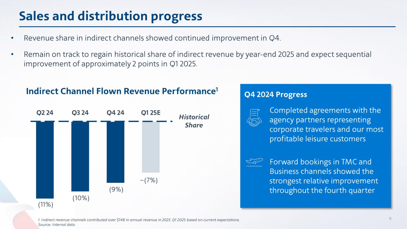 Co-branded credit card agreement • Citi to become the exclusive U.S. issuer of AAdvantage® co-branded credit cards in 2026. • 10-year agreement expected to expand loyalty and rewards offering for AAdvantage® members and Citi-branded cardmembers. • Combined Citi®/AAdvantage® card portfolio projected to drive incremental value for both companies. 8 1. 2024 cash remuneration from co-branded credit card and other partners includes a one-time cash payment received related to the entry into our new co-branded credit card agreement announced in December 2024. Source: Internal data ~ $6.1 billion1 FY 2024 cash remuneration from co- branded credit card and other partners ~ 10% annual growth expected in cash remuneration from co-branded credit card and other partners ~ $1.5 billion projected annual pre-tax income benefit compared to 2024, as cash remuneration from co-branded credit card and other partners approaches $10 billion per year