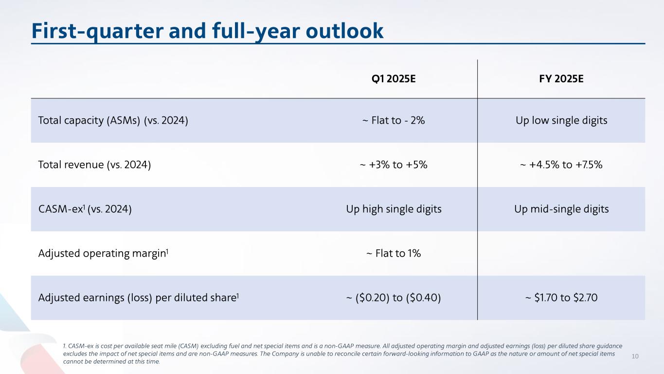 First-quarter and full-year outlook 1. CASM-ex is cost per available seat mile (CASM) excluding fuel and net special items and is a non-GAAP measure. All adjusted operating margin and adjusted earnings (loss) per diluted share guidance excludes the impact of net special items and are non-GAAP measures. The Company is unable to reconcile certain forward-looking information to GAAP as the nature or amount of net special items cannot be determined at this time. Q1 2025E FY 2025E Total capacity (ASMs) (vs. 2024) ~ Flat to - 2% Up low single digits Total revenue (vs. 2024) ~ +3% to +5% ~ +4.5% to +7.5% CASM-ex1 (vs. 2024) Up high single digits Up mid-single digits Adjusted operating margin1 ~ Flat to 1% Adjusted earnings (loss) per diluted share1 ~ ($0.20) to ($0.40) ~ $1.70 to $2.70 10
