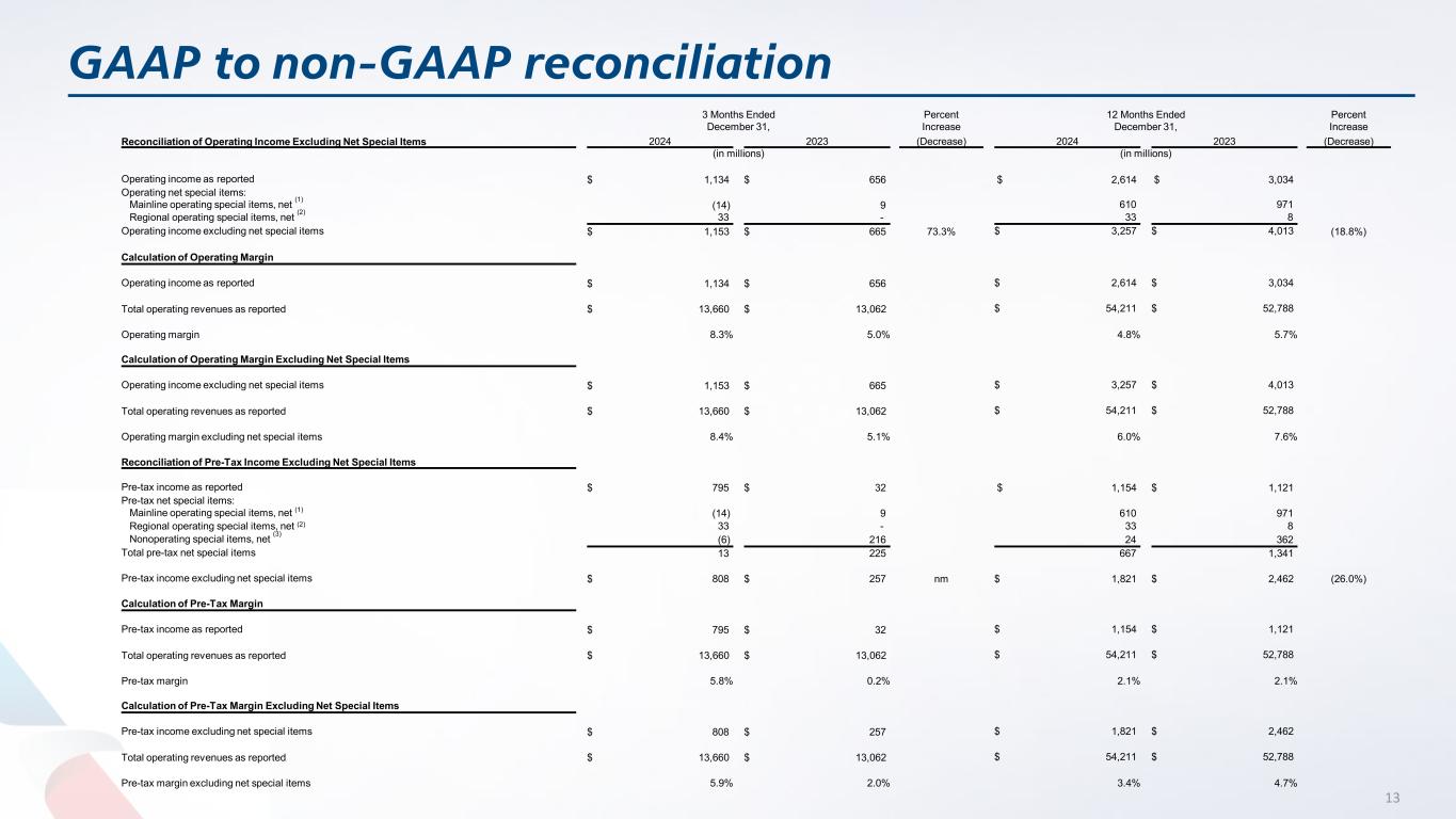 GAAP to non-GAAP reconciliation Reconciliation of Operating Income Excluding Net Special Items 3 Months Ended December 31, Percent Increase 12 Months Ended December 31, Percent Increase 2024 2023 (Decrease) 2024 2023 (Decrease) (in millions) (in millions) Operating income as reported $ 1,134 $ 656 $ 2,614 $ 3,034 Operating net special items: Mainline operating special items, net (1) (14) 9 610 971 Regional operating special items, net (2) 33 - 33 8 Operating income excluding net special items $ 1,153 $ 665 73.3% $ 3,257 $ 4,013 (18.8%) Calculation of Operating Margin Operating income as reported $ 1,134 $ 656 $ 2,614 $ 3,034 Total operating revenues as reported $ 13,660 $ 13,062 $ 54,211 $ 52,788 Operating margin 8.3% 5.0% 4.8% 5.7% Calculation of Operating Margin Excluding Net Special Items Operating income excluding net special items $ 1,153 $ 665 $ 3,257 $ 4,013 Total operating revenues as reported $ 13,660 $ 13,062 $ 54,211 $ 52,788 Operating margin excluding net special items 8.4% 5.1% 6.0% 7.6% Reconciliation of Pre-Tax Income Excluding Net Special Items Pre-tax income as reported $ 795 $ 32 $ 1,154 $ 1,121 Pre-tax net special items: Mainline operating special items, net (1) (14) 9 610 971 Regional operating special items, net (2) 33 - 33 8 Nonoperating special items, net (3) (6) 216 24 362 Total pre-tax net special items 13 225 667 1,341 Pre-tax income excluding net special items $ 808 $ 257 nm $ 1,821 $ 2,462 (26.0%) Calculation of Pre-Tax Margin Pre-tax income as reported $ 795 $ 32 $ 1,154 $ 1,121 Total operating revenues as reported $ 13,660 $ 13,062 $ 54,211 $ 52,788 Pre-tax margin 5.8% 0.2% 2.1% 2.1% Calculation of Pre-Tax Margin Excluding Net Special Items Pre-tax income excluding net special items $ 808 $ 257 $ 1,821 $ 2,462 Total operating revenues as reported $ 13,660 $ 13,062 $ 54,211 $ 52,788 Pre-tax margin excluding net special items 5.9% 2.0% 3.4% 4.7% 13