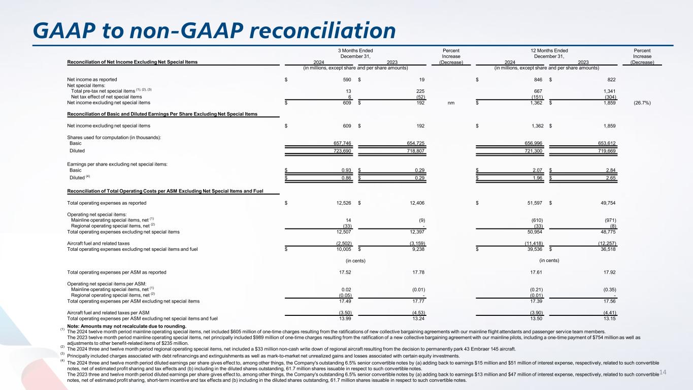 GAAP to non-GAAP reconciliation 3 Months Ended December 31, Percent Increase 12 Months Ended December 31, Percent Increase Reconciliation of Net Income Excluding Net Special Items 2024 2023 (Decrease) 2024 2023 (Decrease) (in millions, except share and per share amounts) (in millions, except share and per share amounts) Net income as reported $ 590 $ 19 $ 846 $ 822 Net special items: Total pre-tax net special items (1), (2), (3) 13 225 667 1,341 Net tax effect of net special items 6 (52) (151) (304) Net income excluding net special items $ 609 $ 192 nm $ 1,362 $ 1,859 (26.7%) Reconciliation of Basic and Diluted Earnings Per Share Excluding Net Special Items Net income excluding net special items $ 609 $ 192 $ 1,362 $ 1,859 Shares used for computation (in thousands): Basic 657,746 654,725 656,996 653,612 Diluted 723,690 718,807 721,300 719,669 Earnings per share excluding net special items: Basic $ 0.93 $ 0.29 $ 2.07 $ 2.84 Diluted (4) $ 0.86 $ 0.29 $ 1.96 $ 2.65 Reconciliation of Total Operating Costs per ASM Excluding Net Special Items and Fuel Total operating expenses as reported $ 12,526 $ 12,406 $ 51,597 $ 49,754 Operating net special items: Mainline operating special items, net (1) 14 (9) (610) (971) Regional operating special items, net (2) (33) - (33) (8) Total operating expenses excluding net special items 12,507 12,397 50,954 48,775 Aircraft fuel and related taxes (2,502) (3,159) (11,418) (12,257) Total operating expenses excluding net special items and fuel $ 10,005 $ 9,238 $ 39,536 $ 36,518 (in cents) (in cents) Total operating expenses per ASM as reported 17.52 17.78 17.61 17.92 Operating net special items per ASM: Mainline operating special items, net (1) 0.02 (0.01) (0.21) (0.35) Regional operating special items, net (2) (0.05) - (0.01) - Total operating expenses per ASM excluding net special items 17.49 17.77 17.39 17.56 Aircraft fuel and related taxes per ASM (3.50) (4.53) (3.90) (4.41) Total operating expenses per ASM excluding net special items and fuel 13.99 13.24 13.50 13.15 Note: Amounts may not recalculate due to rounding. (1) The 2024 twelve month period mainline operating special items, net included $605 million of one-time charges resulting from the ratifications of new collective bargaining agreements with our mainline flight attendants and passenger service team members. The 2023 twelve month period mainline operating special items, net principally included $989 million of one-time charges resulting from the ratification of a new collective bargaining agreement with our mainline pilots, including a one-time payment of $754 million as well as adjustments to other benefit-related items of $235 million. (2) The 2024 three and twelve month period regional operating special items, net included a $33 million non-cash write down of regional aircraft resulting from the decision to permanently park 43 Embraer 145 aircraft. (3) Principally included charges associated with debt refinancings and extinguishments as well as mark-to-market net unrealized gains and losses associated with certain equity investments. (4) The 2024 three and twelve month period diluted earnings per share gives effect to, among other things, the Company's outstanding 6.5% senior convertible notes by (a) adding back to earnings $15 million and $51 million of interest expense, respectively, related to such convertible notes, net of estimated profit sharing and tax effects and (b) including in the diluted shares outstanding, 61.7 million shares issuable in respect to such convertible notes. The 2023 three and twelve month period diluted earnings per share gives effect to, among other things, the Company's outstanding 6.5% senior convertible notes by (a) adding back to earnings $13 million and $47 million of interest expense, respectively, related to such convertible notes, net of estimated profit sharing, short-term incentive and tax effects and (b) including in the diluted shares outstanding, 61.7 million shares issuable in respect to such convertible notes. 14