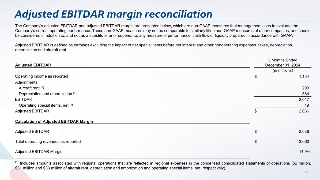 Adjusted EBITDAR margin reconciliation The Company's adjusted EBITDAR and adjusted EBITDAR margin are presented below, which are non-GAAP measures that management uses to evaluate the Company's current operating performance. These non-GAAP measures may not be comparable to similarly titled non-GAAP measures of other companies, and should be considered in addition to, and not as a substitute for or superior to, any measure of performance, cash flow or liquidity prepared in accordance with GAAP. Adjusted EBITDAR is defined as earnings excluding the impact of net special items before net interest and other nonoperating expenses, taxes, depreciation, amortization and aircraft rent. 3 Months Ended Adjusted EBITDAR December 31, 2024 (in millions) Operating income as reported $ 1,134 Adjustments: Aircraft rent (1) 299 Depreciation and amortization (1) 584 EBITDAR 2,017 Operating special items, net (1) 19 Adjusted EBITDAR $ 2,036 Calculation of Adjusted EBITDAR Margin Adjusted EBITDAR $ 2,036 Total operating revenues as reported $ 13,660 Adjusted EBITDAR Margin 14.9% (1) Includes amounts associated with regional operations that are reflected in regional expenses in the condensed consolidated statements of operations ($2 million, $81 million and $33 million of aircraft rent, depreciation and amortization and operating special items, net, respectively). 16
