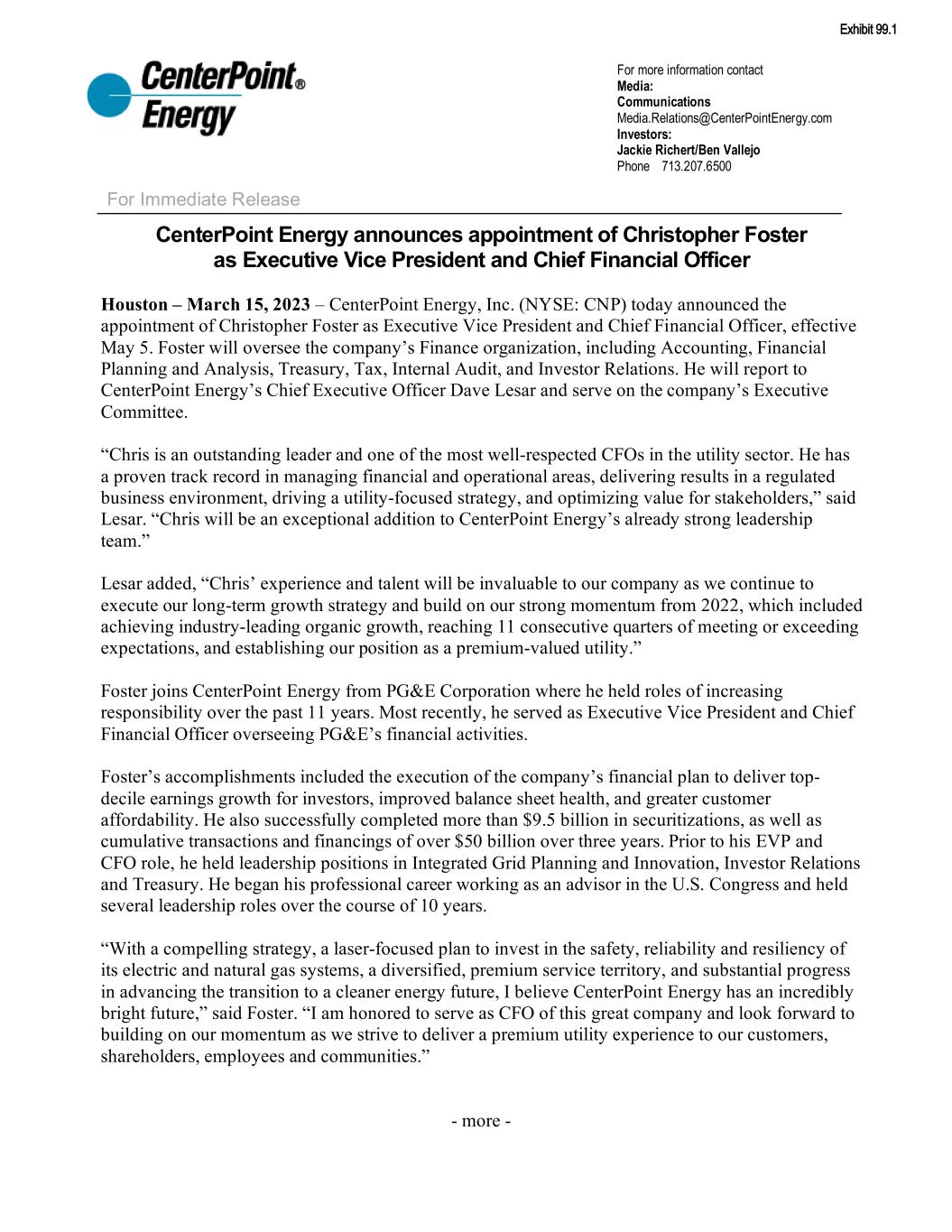 For Immediate Release For more information contact Media: Communications Media.Relations@CenterPointEnergy.com Investors: Jackie Richert/Ben Vallejo Phone 713.207.6500 CenterPoint Energy announces appointment of Christopher Foster as Executive Vice President and Chief Financial Officer Houston – March 15, 2023 – CenterPoint Energy, Inc. (NYSE: CNP) today announced the appointment of Christopher Foster as Executive Vice President and Chief Financial Officer, effective May 5. Foster will oversee the company’s Finance organization, including Accounting, Financial Planning and Analysis, Treasury, Tax, Internal Audit, and Investor Relations. He will report to CenterPoint Energy’s Chief Executive Officer Dave Lesar and serve on the company’s Executive Committee. “Chris is an outstanding leader and one of the most well-respected CFOs in the utility sector. He has a proven track record in managing financial and operational areas, delivering results in a regulated business environment, driving a utility-focused strategy, and optimizing value for stakeholders,” said Lesar. “Chris will be an exceptional addition to CenterPoint Energy’s already strong leadership team.” Lesar added, “Chris’ experience and talent will be invaluable to our company as we continue to execute our long-term growth strategy and build on our strong momentum from 2022, which included achieving industry-leading organic growth, reaching 11 consecutive quarters of meeting or exceeding expectations, and establishing our position as a premium-valued utility.” Foster joins CenterPoint Energy from PG&E Corporation where he held roles of increasing responsibility over the past 11 years. Most recently, he served as Executive Vice President and Chief Financial Officer overseeing PG&E’s financial activities. Foster’s accomplishments included the execution of the company’s financial plan to deliver top- decile earnings growth for investors, improved balance sheet health, and greater customer affordability. He also successfully completed more than $9.5 billion in securitizations, as well as cumulative transactions and financings of over $50 billion over three years. Prior to his EVP and CFO role, he held leadership positions in Integrated Grid Planning and Innovation, Investor Relations and Treasury. He began his professional career working as an advisor in the U.S. Congress and held several leadership roles over the course of 10 years. “With a compelling strategy, a laser-focused plan to invest in the safety, reliability and resiliency of its electric and natural gas systems, a diversified, premium service territory, and substantial progress in advancing the transition to a cleaner energy future, I believe CenterPoint Energy has an incredibly bright future,” said Foster. “I am honored to serve as CFO of this great company and look forward to building on our momentum as we strive to deliver a premium utility experience to our customers, shareholders, employees and communities.” - more - Exhibit 99.1