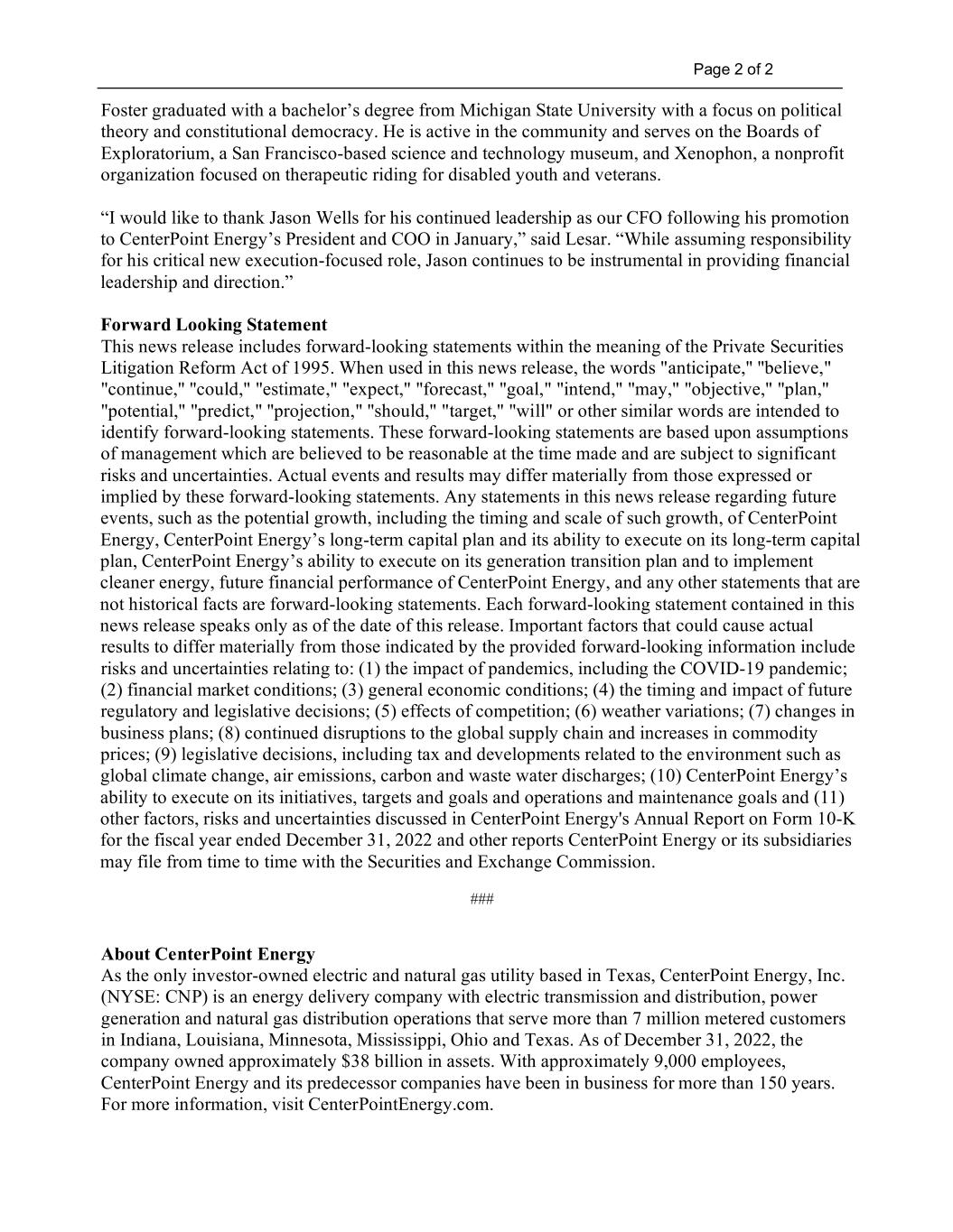 Page 2 of 2 Foster graduated with a bachelor’s degree from Michigan State University with a focus on political theory and constitutional democracy. He is active in the community and serves on the Boards of Exploratorium, a San Francisco-based science and technology museum, and Xenophon, a nonprofit organization focused on therapeutic riding for disabled youth and veterans. “I would like to thank Jason Wells for his continued leadership as our CFO following his promotion to CenterPoint Energy’s President and COO in January,” said Lesar. “While assuming responsibility for his critical new execution-focused role, Jason continues to be instrumental in providing financial leadership and direction.” Forward Looking Statement This news release includes forward-looking statements within the meaning of the Private Securities Litigation Reform Act of 1995. When used in this news release, the words "anticipate," "believe," "continue," "could," "estimate," "expect," "forecast," "goal," "intend," "may," "objective," "plan," "potential," "predict," "projection," "should," "target," "will" or other similar words are intended to identify forward-looking statements. These forward-looking statements are based upon assumptions of management which are believed to be reasonable at the time made and are subject to significant risks and uncertainties. Actual events and results may differ materially from those expressed or implied by these forward-looking statements. Any statements in this news release regarding future events, such as the potential growth, including the timing and scale of such growth, of CenterPoint Energy, CenterPoint Energy’s long-term capital plan and its ability to execute on its long-term capital plan, CenterPoint Energy’s ability to execute on its generation transition plan and to implement cleaner energy, future financial performance of CenterPoint Energy, and any other statements that are not historical facts are forward-looking statements. Each forward-looking statement contained in this news release speaks only as of the date of this release. Important factors that could cause actual results to differ materially from those indicated by the provided forward-looking information include risks and uncertainties relating to: (1) the impact of pandemics, including the COVID-19 pandemic; (2) financial market conditions; (3) general economic conditions; (4) the timing and impact of future regulatory and legislative decisions; (5) effects of competition; (6) weather variations; (7) changes in business plans; (8) continued disruptions to the global supply chain and increases in commodity prices; (9) legislative decisions, including tax and developments related to the environment such as global climate change, air emissions, carbon and waste water discharges; (10) CenterPoint Energy’s ability to execute on its initiatives, targets and goals and operations and maintenance goals and (11) other factors, risks and uncertainties discussed in CenterPoint Energy's Annual Report on Form 10-K for the fiscal year ended December 31, 2022 and other reports CenterPoint Energy or its subsidiaries may file from time to time with the Securities and Exchange Commission. ### About CenterPoint Energy As the only investor-owned electric and natural gas utility based in Texas, CenterPoint Energy, Inc. (NYSE: CNP) is an energy delivery company with electric transmission and distribution, power generation and natural gas distribution operations that serve more than 7 million metered customers in Indiana, Louisiana, Minnesota, Mississippi, Ohio and Texas. As of December 31, 2022, the company owned approximately $38 billion in assets. With approximately 9,000 employees, CenterPoint Energy and its predecessor companies have been in business for more than 150 years. For more information, visit CenterPointEnergy.com.