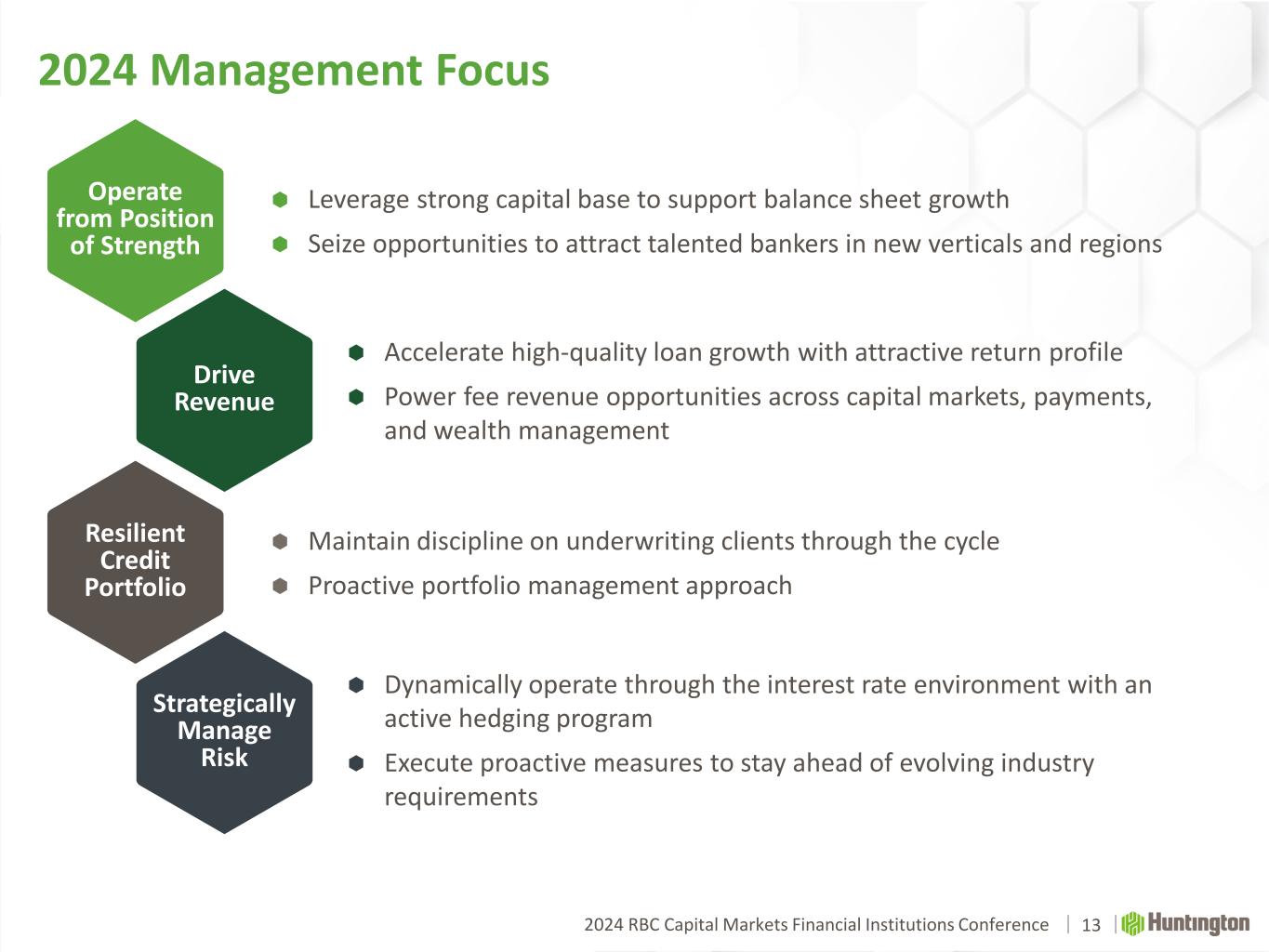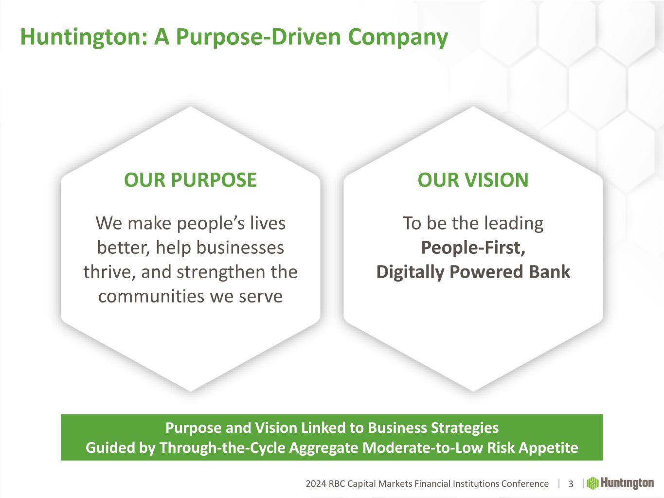2024 RBC Capital Markets Financial Institutions Conference Disclaimer 2 CAUTION REGARDING FORWARD-LOOKING STATEMENTS The information contained or incorporated by reference in this presentation contains certain forward-looking statements, including, but not limited to, certain plans, expectations, goals, projections, and statements, which are not historical facts and are subject to numerous assumptions, risks, and uncertainties. Statements that do not describe historical or current facts, including statements about beliefs and expectations, are forward-looking statements. Forward-looking statements may be identified by words such as expect, anticipate, believe, intend, estimate, plan, target, goal, or similar expressions, or future or conditional verbs such as will, may, might, should, would, could, or similar variations. The forward-looking statements are intended to be subject to the safe harbor provided by Section 27A of the Securities Act of 1933, Section 21E of the Securities Exchange Act of 1934, and the Private Securities Litigation Reform Act of 1995. While there is no assurance that any list of risks and uncertainties or risk factors is complete, below are certain factors which could cause actual results to differ materially from those contained or implied in the forward-looking statements: changes in general economic, political, or industry conditions; deterioration in business and economic conditions, including persistent inflation, supply chain issues or labor shortages, instability in global economic conditions and geopolitical matters, as well as volatility in financial markets; the impact of pandemics, including the COVID-19 pandemic and related variants and mutations, and their impact on the global economy and financial market conditions and our business, results of operations, and financial condition; the impacts related to or resulting from recent bank failures and other volatility, including potential increased regulatory requirements and costs, such as FDIC special assessments, long-term debt requirements and heightened capital requirements, and potential impacts to macroeconomic conditions, which could affect the ability of depository institutions, including us, to attract and retain depositors and to borrow or raise capital; unexpected outflows of uninsured deposits which may require us to sell investment securities at a loss; rising interest rates which could negatively impact the value of our portfolio of investment securities; the loss of value of our investment portfolio which could negatively impact market perceptions of us and could lead to deposit withdrawals; the effects of social media on market perceptions of us and banks generally; cybersecurity risks; uncertainty in U.S. fiscal and monetary policy, including the interest rate policies of the Federal Reserve; volatility and disruptions in global capital and credit markets; movements in interest rates; competitive pressures on product pricing and services; success, impact, and timing of our business strategies, including market acceptance of any new products or services including those implementing our “Fair Play” banking philosophy; the nature, extent, timing, and results of governmental actions, examinations, reviews, reforms, regulations, and interpretations, including those related to the Dodd-Frank Wall Street Reform and Consumer Protection Act and the Basel III regulatory capital reforms, as well as those involving the OCC, Federal Reserve, FDIC, and CFPB; and other factors that may affect the future results of Huntington. Additional factors that could cause results to differ materially from those described above can be found in Huntington’s Annual Report on Form 10-K for the year ended December 31, 2023, which is on file with the Securities and Exchange Commission (the “SEC”) and available in the “Investor Relations” section of Huntington’s website http://www.huntington.com, under the heading “Publications and Filings” and in other documents Huntington files with the SEC. All forward-looking statements speak only as of the date they are made and are based on information available at that time. Huntington does not assume any obligation to update forward-looking statements to reflect circumstances or events that occur after the date the forward-looking statements were made or to reflect the occurrence of unanticipated events except as required by federal securities laws. As forward-looking statements involve significant risks and uncertainties, caution should be exercised against placing undue reliance on such statements.